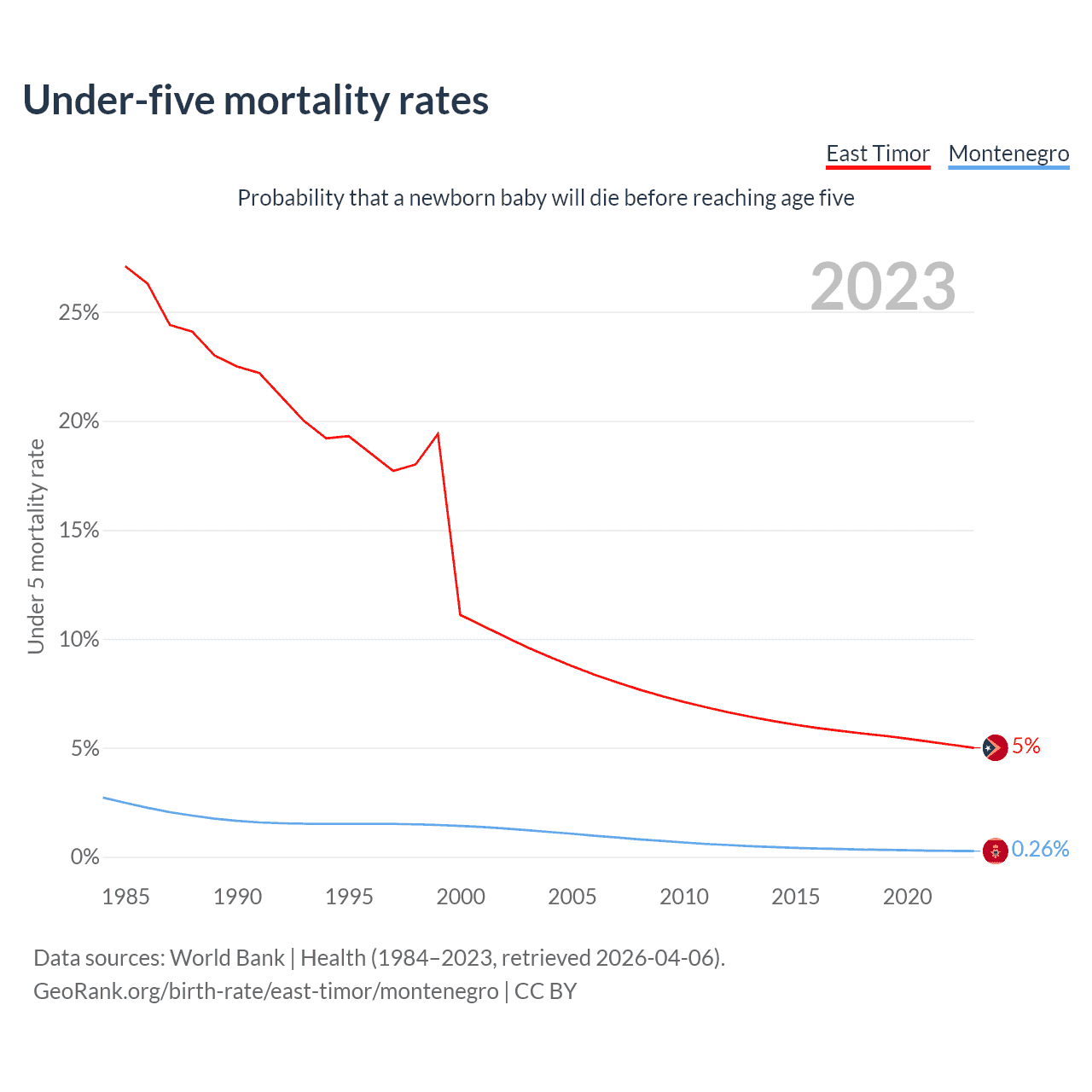 The chance that a newborn baby will die before reaching age five is 5% in East Timor and 0.26% in Montenegro. Above is a chart with historical data on under-five mortality rates.
