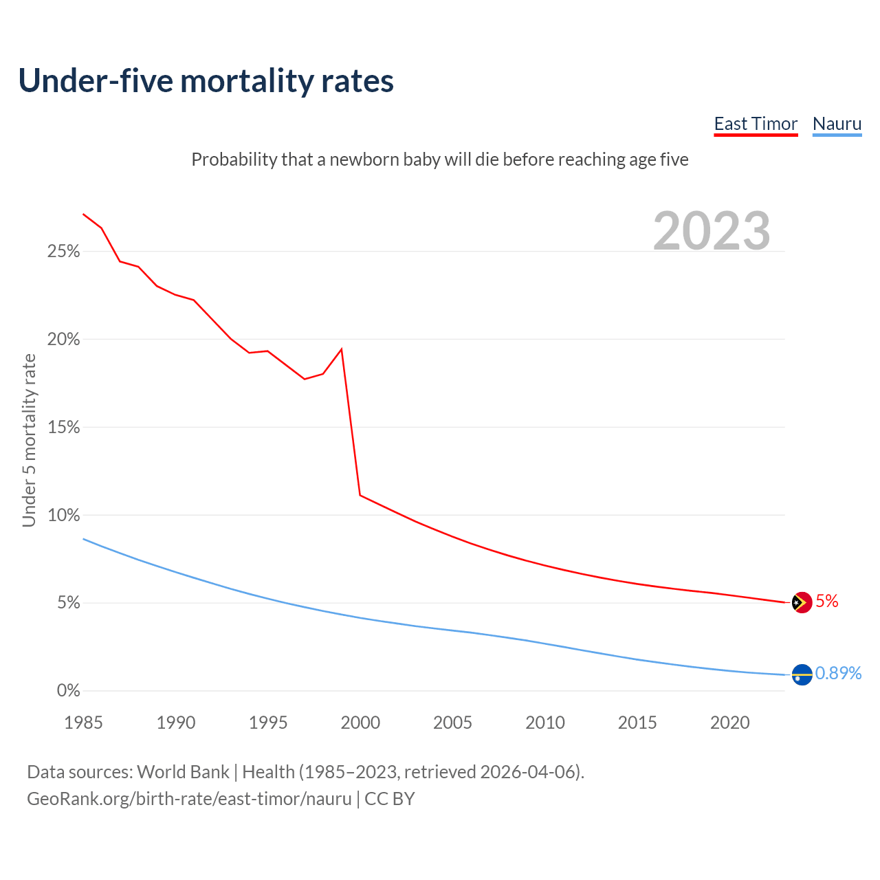 The chance that a newborn baby will die before reaching age five is 5% in East Timor and 0.89% in Nauru. Above is a chart with historical data on under-five mortality rates.