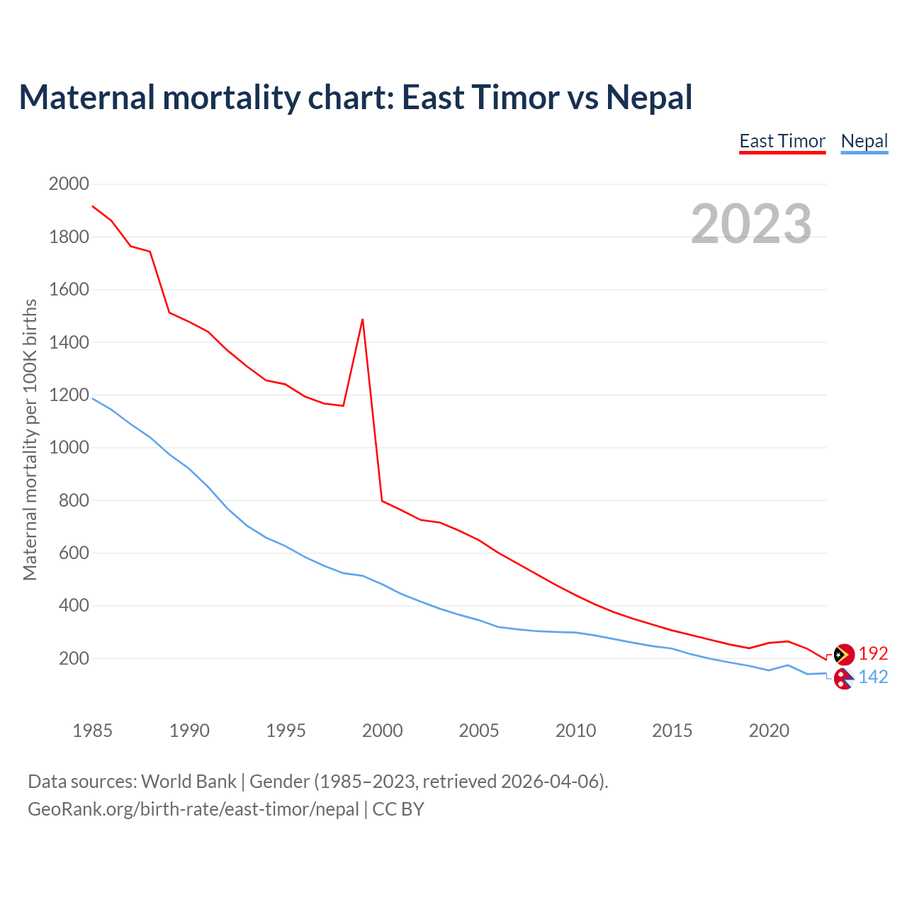 The maternal mortality rate, which is the probability of dying during childbirth or within 42 days of pregnancy termination, is 192 deaths per 100,000 live births in East Timor, compared to 142 deaths in Nepal.