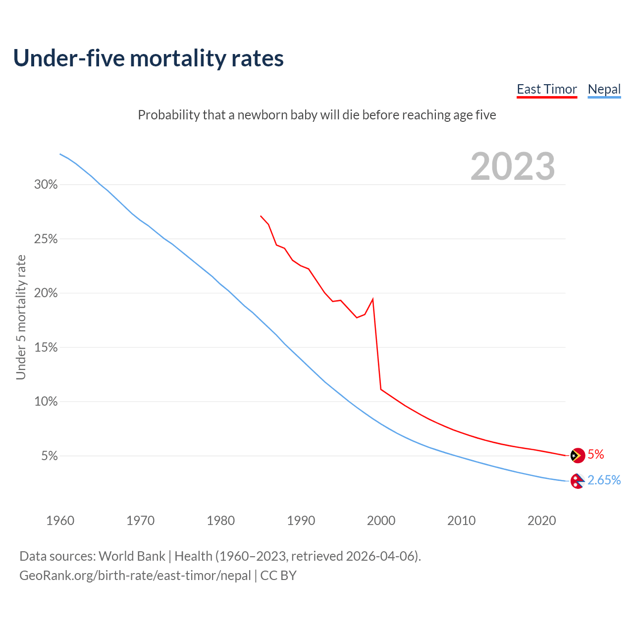 The chance that a newborn baby will die before reaching age five is 5% in East Timor and 2.65% in Nepal. Above is a chart with historical data on under-five mortality rates.