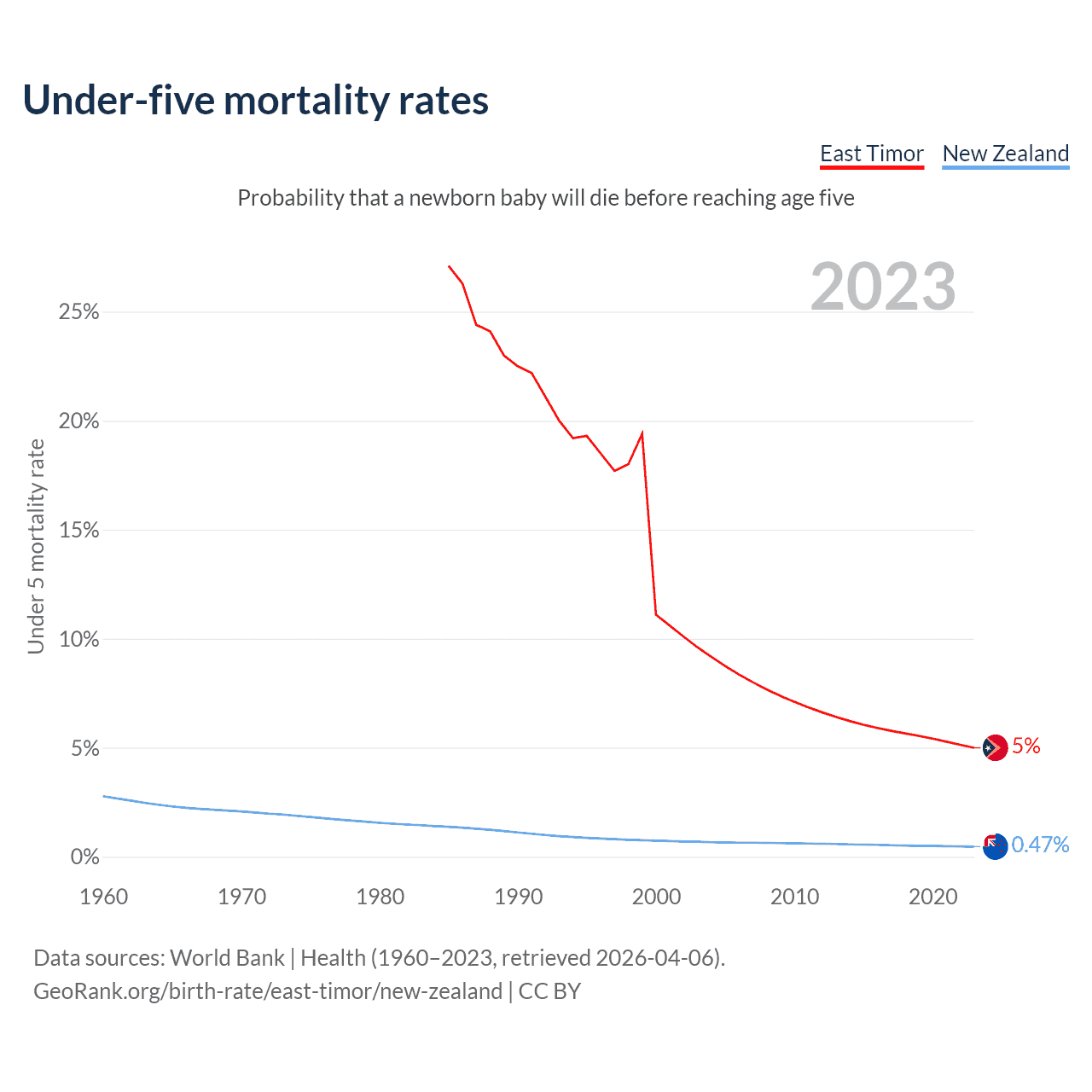 The chance that a newborn baby will die before reaching age five is 5% in East Timor and 0.47% in New Zealand. Above is a chart with historical data on under-five mortality rates.