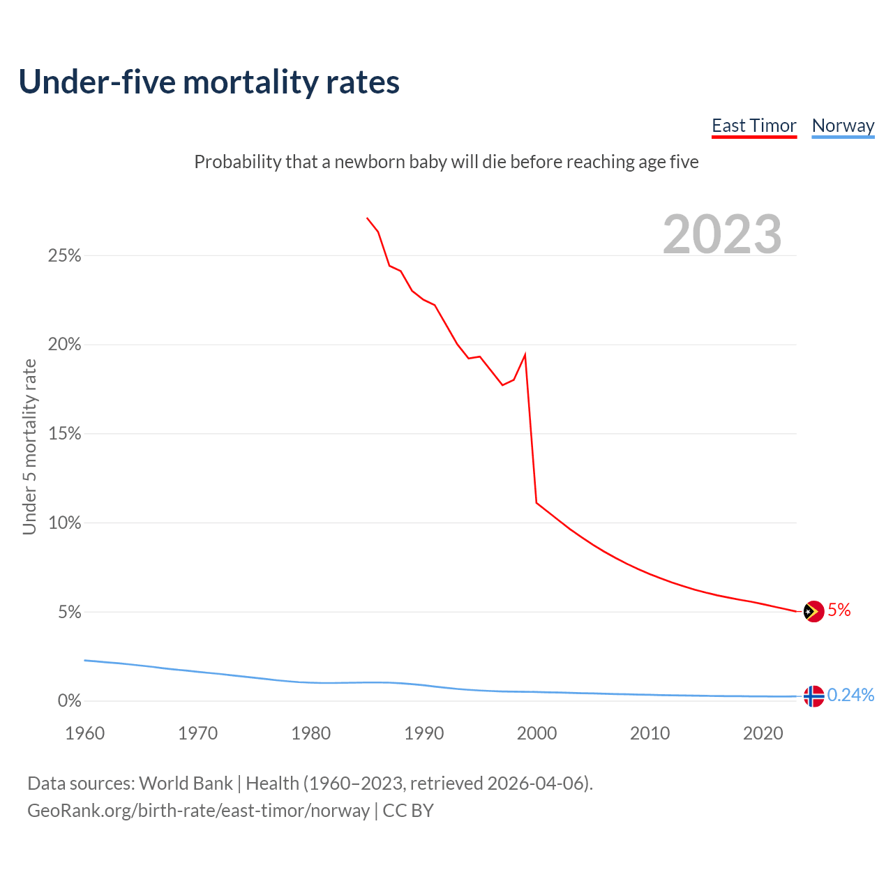 The chance that a newborn baby will die before reaching age five is 5% in East Timor and 0.24% in Norway. Above is a chart with historical data on under-five mortality rates.