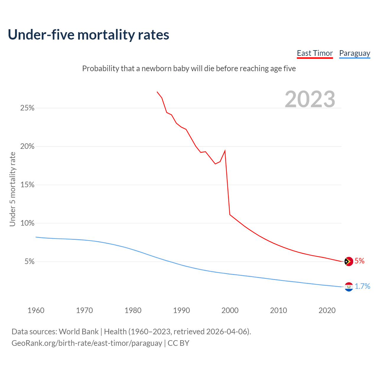 The chance that a newborn baby will die before reaching age five is 5% in East Timor and 1.7% in Paraguay. Above is a chart with historical data on under-five mortality rates.