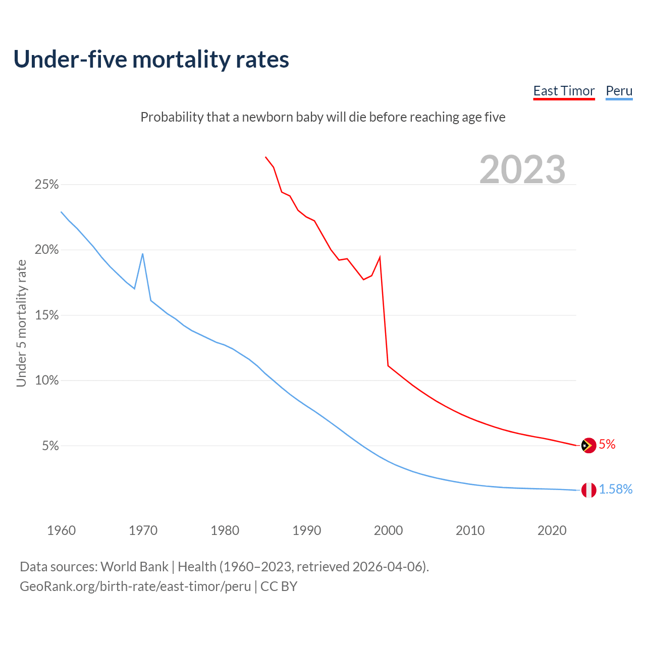 The chance that a newborn baby will die before reaching age five is 5% in East Timor and 1.58% in Peru. Above is a chart with historical data on under-five mortality rates.