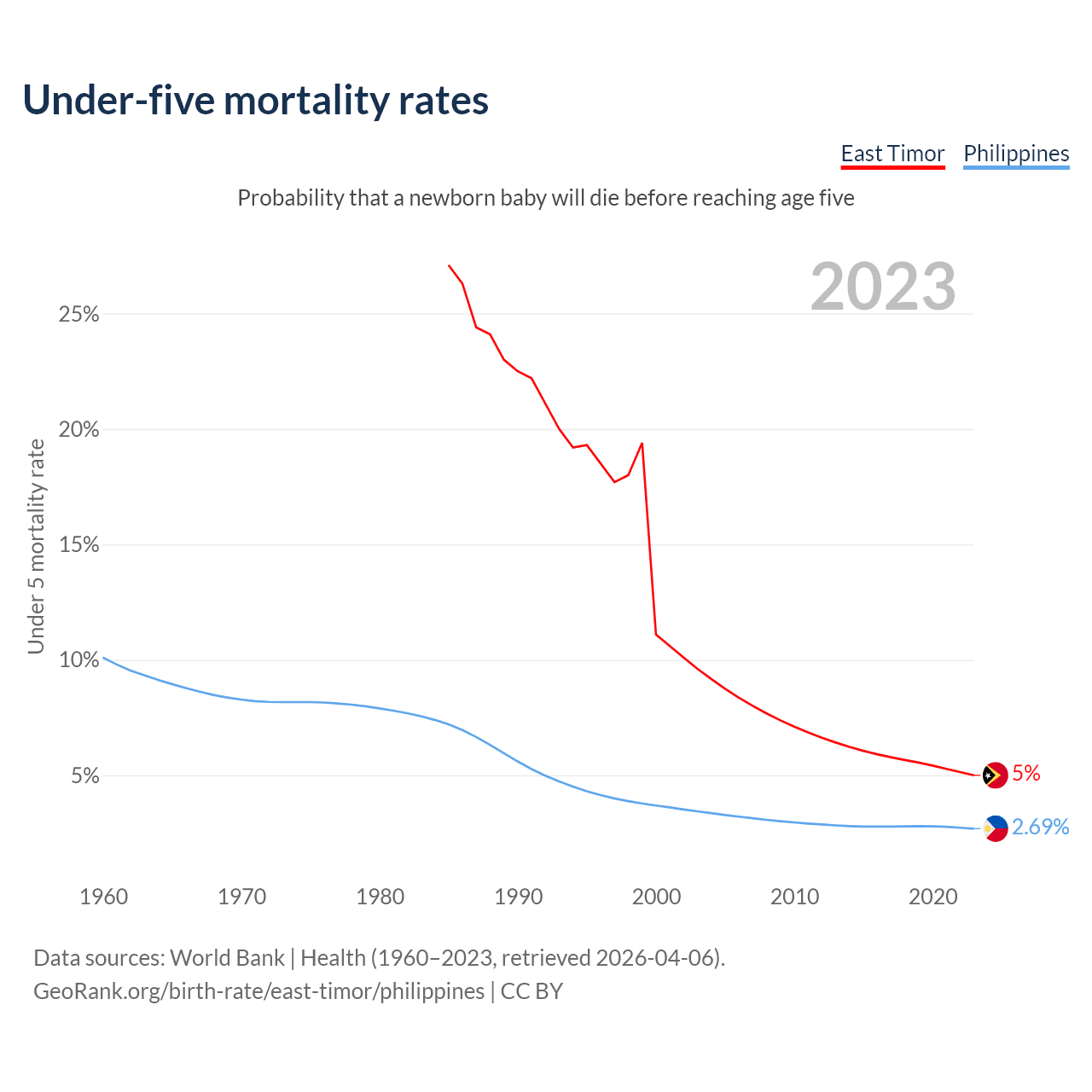 The chance that a newborn baby will die before reaching age five is 5% in East Timor and 2.69% in the Philippines. Above is a chart with historical data on under-five mortality rates.