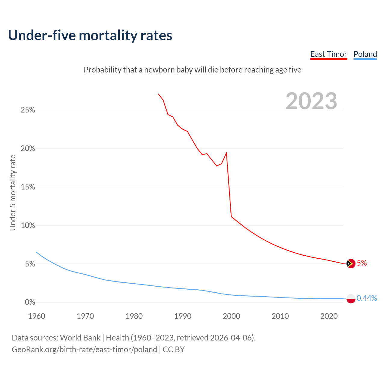 The chance that a newborn baby will die before reaching age five is 5% in East Timor and 0.44% in Poland. Above is a chart with historical data on under-five mortality rates.