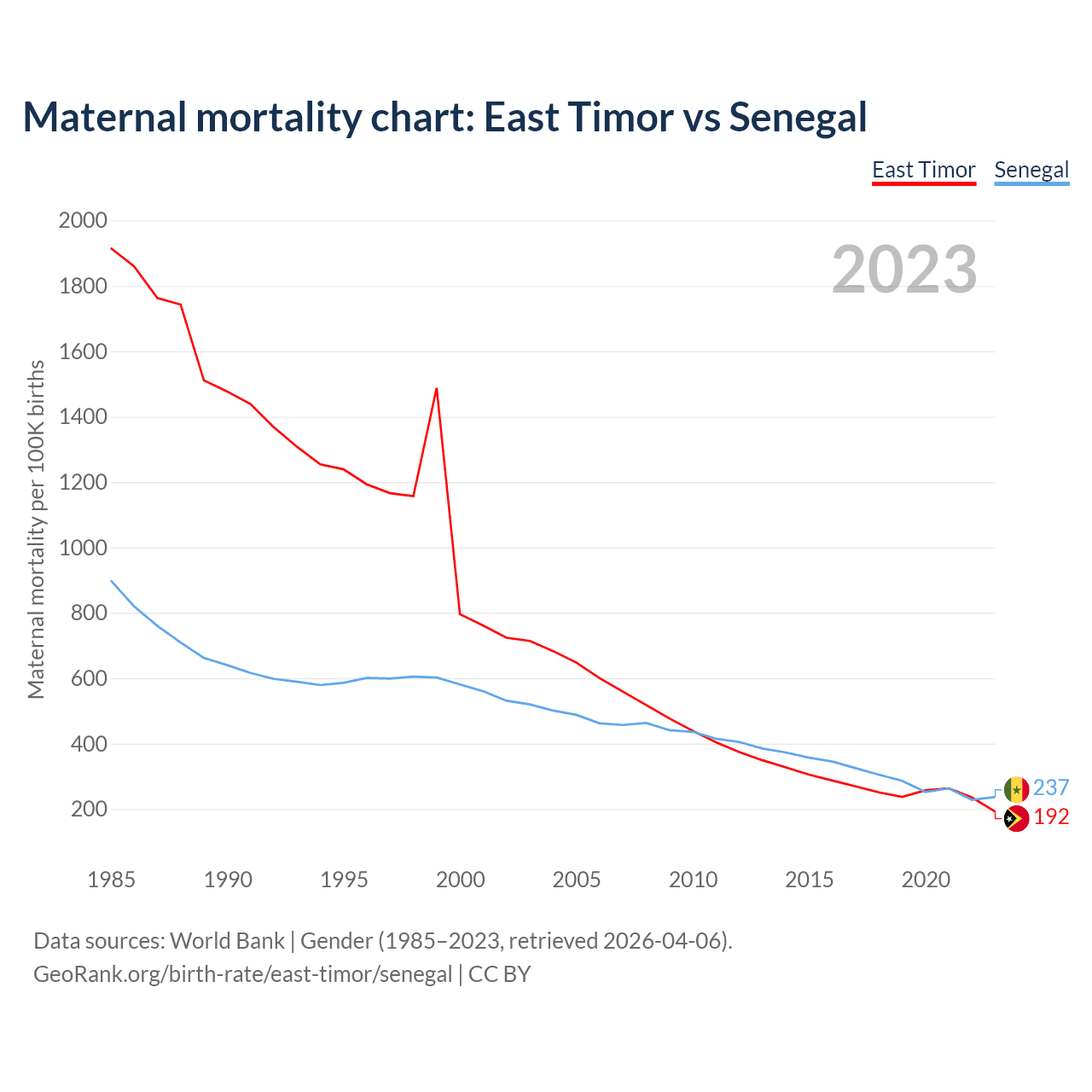 The maternal mortality rate, which is the probability of dying during childbirth or within 42 days of pregnancy termination, is 192 deaths per 100,000 live births in East Timor, compared to 237 deaths in Senegal.