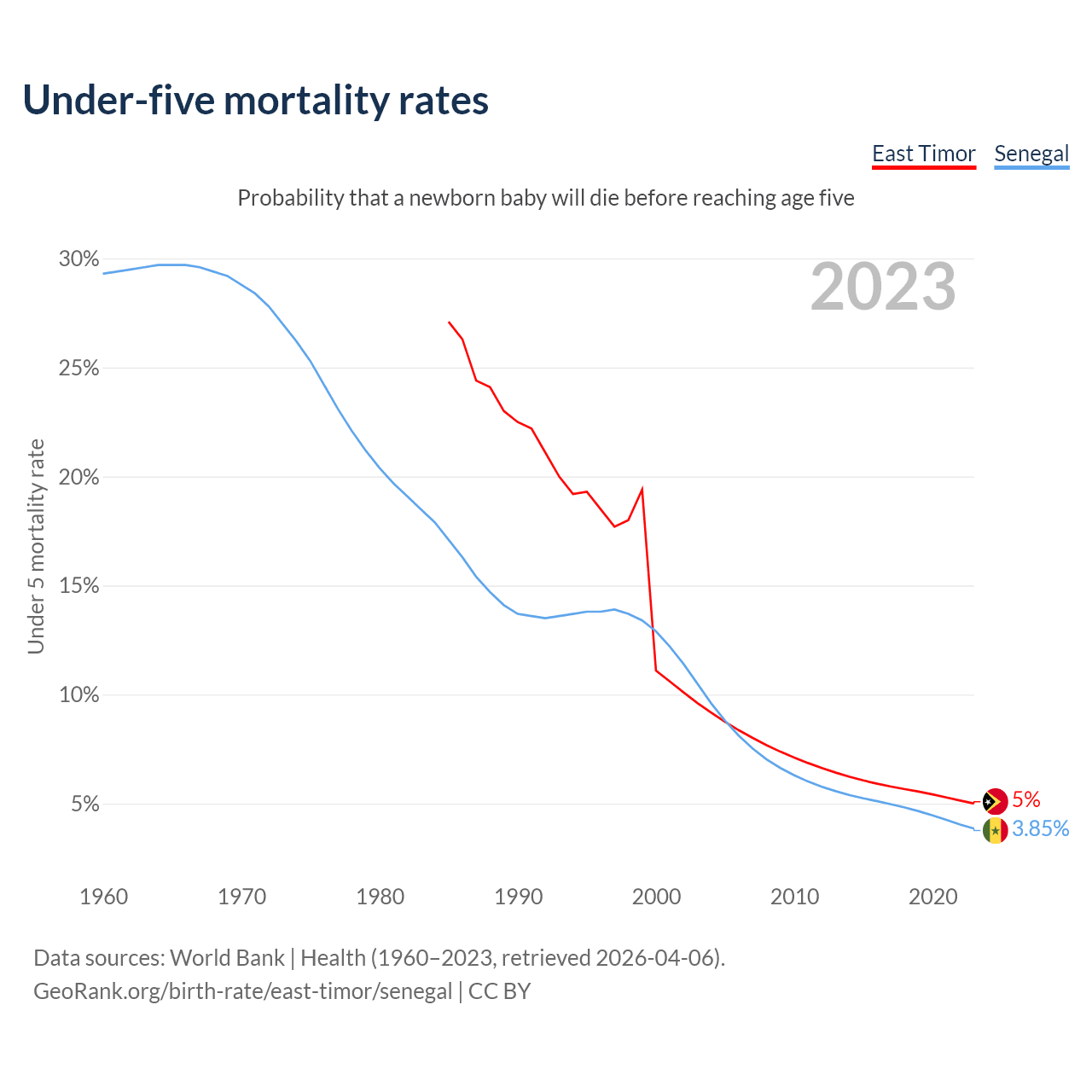 The chance that a newborn baby will die before reaching age five is 5% in East Timor and 3.85% in Senegal. Above is a chart with historical data on under-five mortality rates.