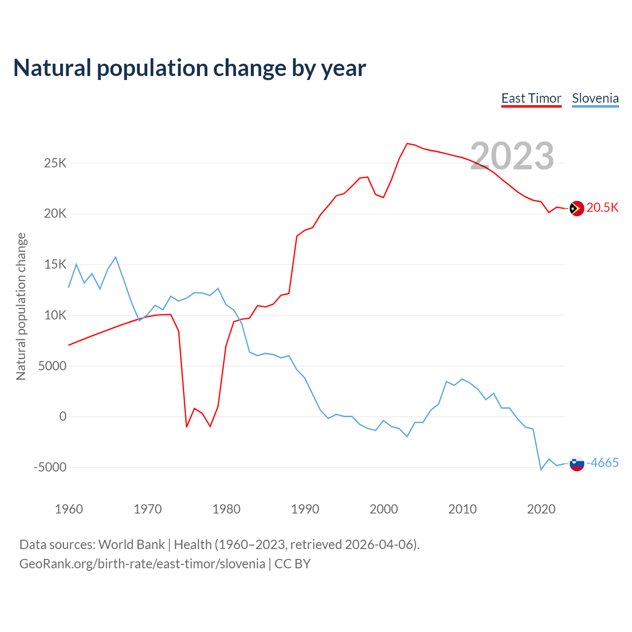 East Timor has an annual birth rate of 22.1 births per 1,000 people, compared to 8 for Slovenia. The average number of children a woman is expected to have during her lifetime — the fertility rate, is 2.71 in East Timor and 1.51 in Slovenia — 44.2% difference.
