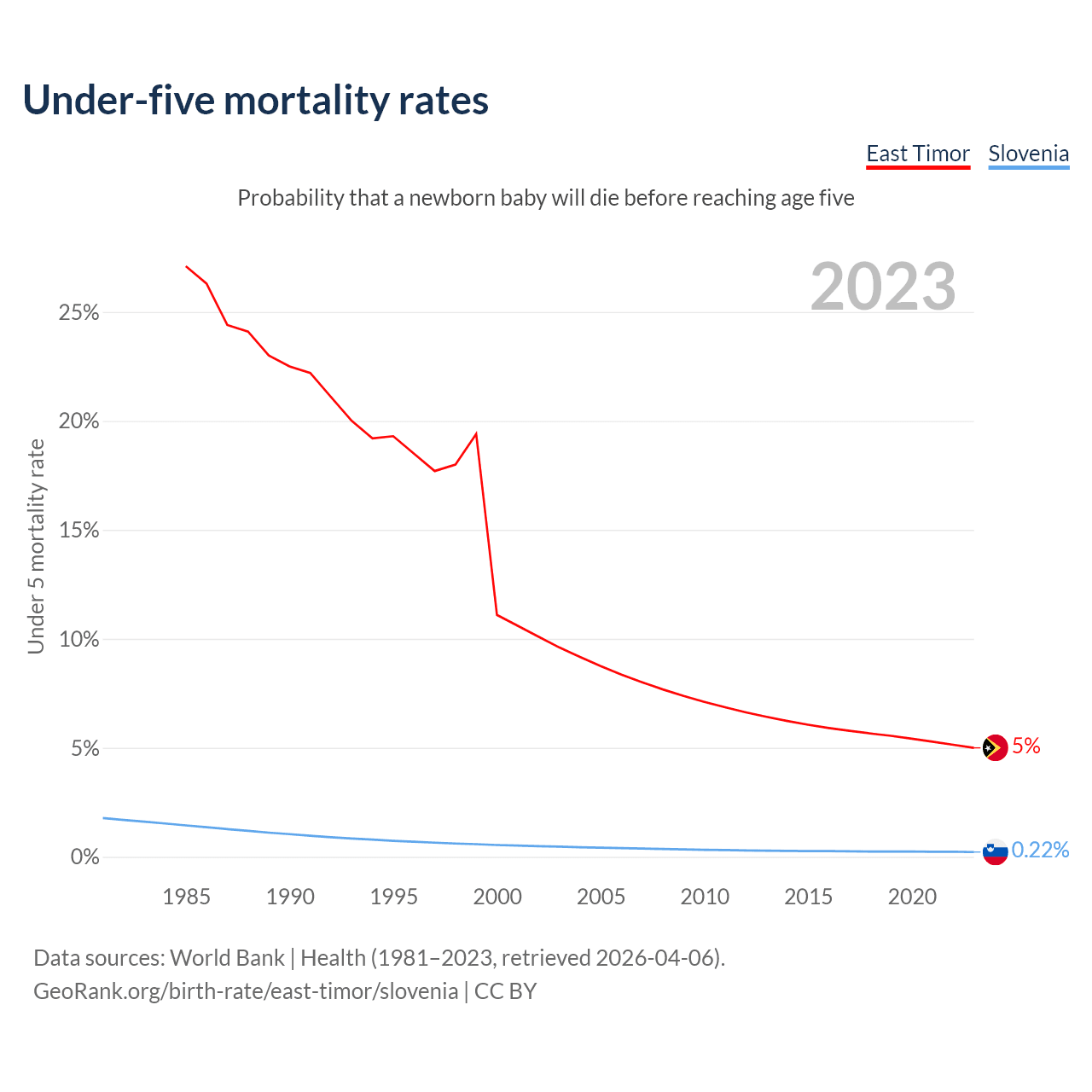 The chance that a newborn baby will die before reaching age five is 5% in East Timor and 0.22% in Slovenia. Above is a chart with historical data on under-five mortality rates.