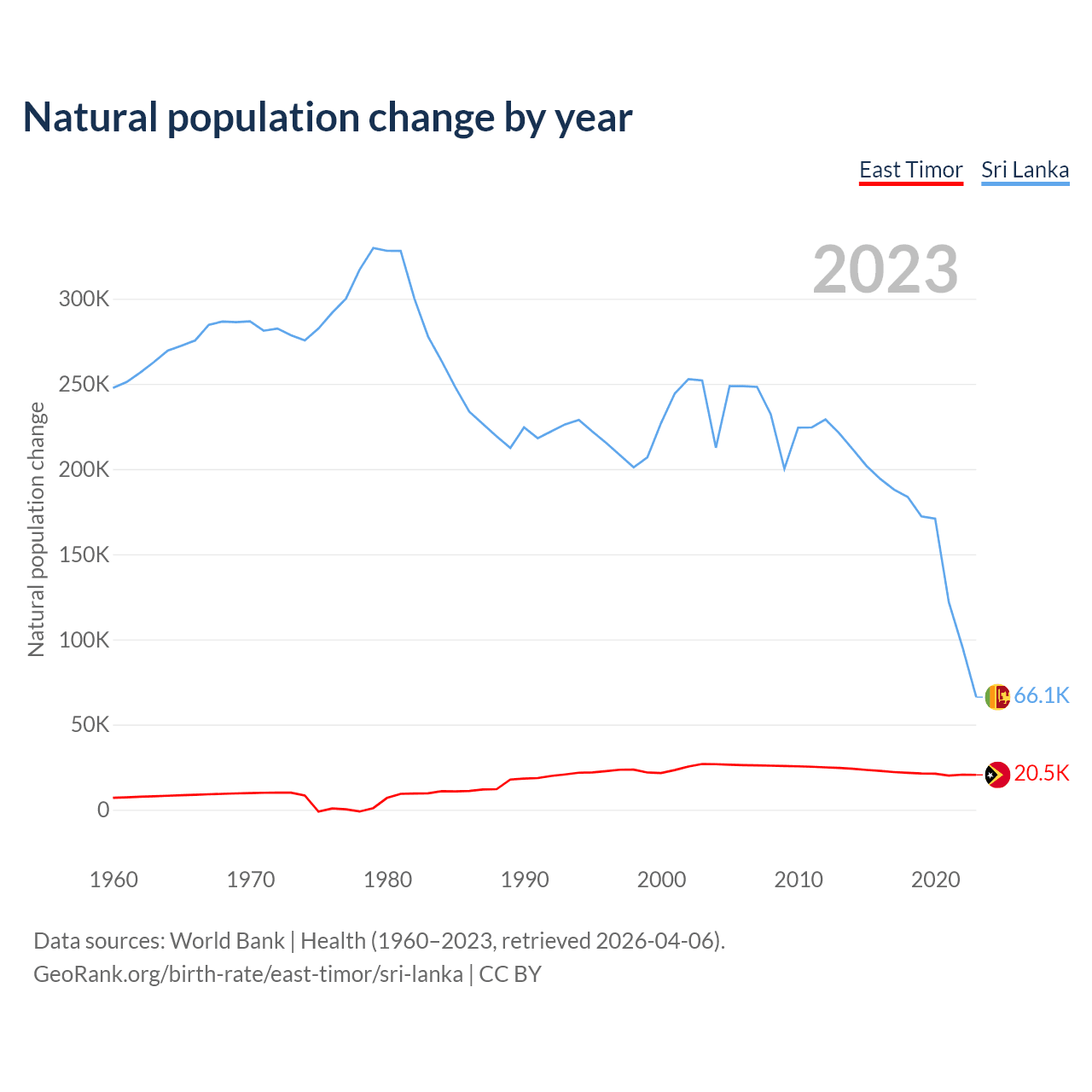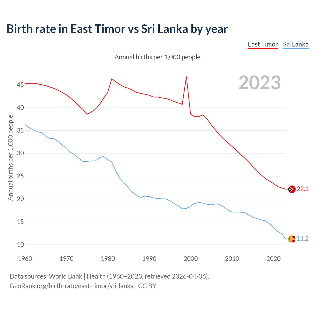 East Timor has an annual birth rate of 22.1 births per 1,000 people, compared to 11.2 for Sri Lanka. The average number of children a woman is expected to have during her lifetime — the fertility rate, is 2.71 in East Timor and 1.97 in Sri Lanka — 27.1% difference.