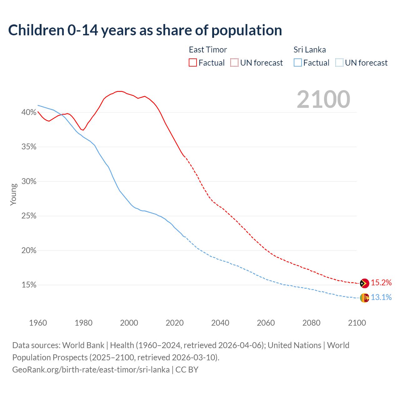 According to the latest available data on birth rates, the fertility rate in East Timor was 2.71 children per woman in 2023, compared to 1.97 in Sri Lanka in 2023. The replacement level is considered to be 2.1 children per woman.