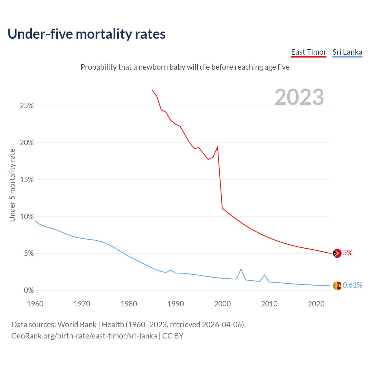 The chance that a newborn baby will die before reaching age five is 5% in East Timor and 0.61% in Sri Lanka. Above is a chart with historical data on under-five mortality rates.