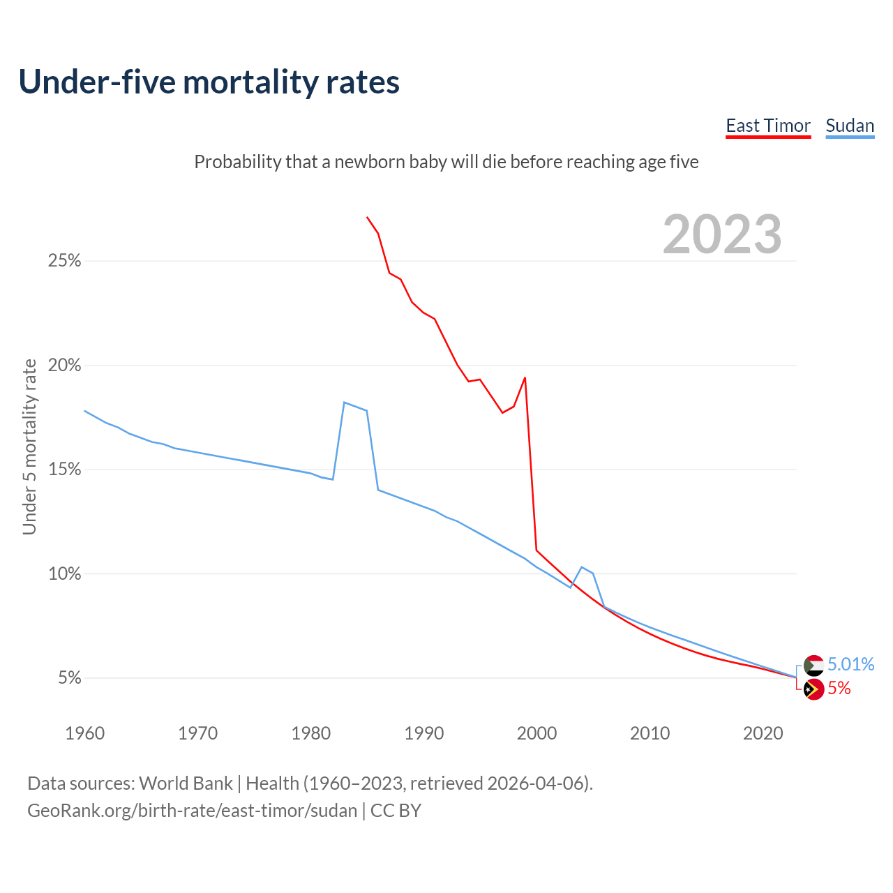 The chance that a newborn baby will die before reaching age five is 5% in East Timor and 5.01% in Sudan. Above is a chart with historical data on under-five mortality rates.