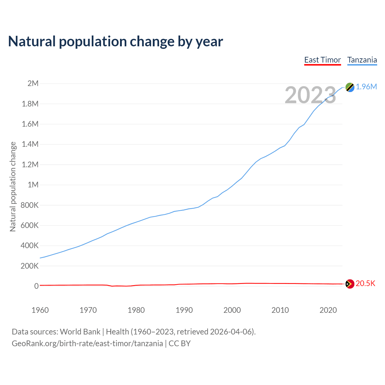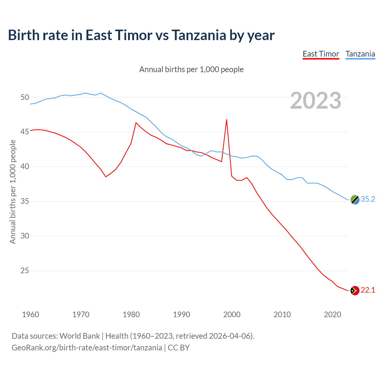 East Timor has an annual birth rate of 22.1 births per 1,000 people, compared to 35.2 for Tanzania. The average number of children a woman is expected to have during her lifetime — the fertility rate, is 2.71 in East Timor and 4.61 in Tanzania — 70.2% difference.
