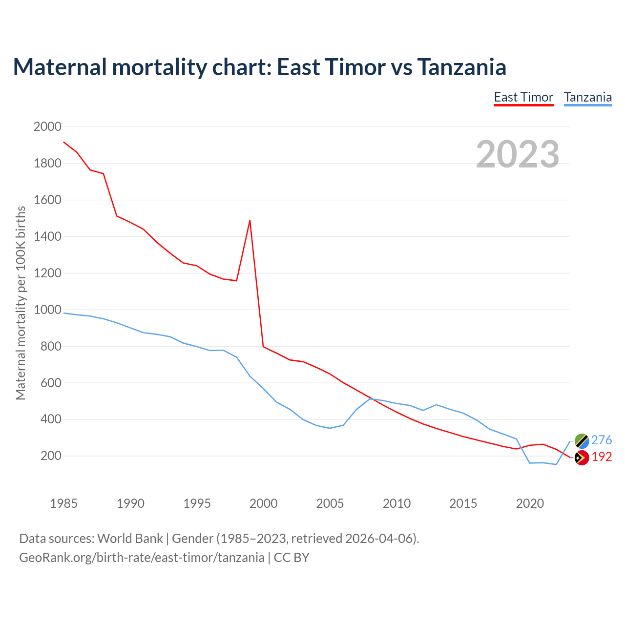 The maternal mortality rate, which is the probability of dying during childbirth or within 42 days of pregnancy termination, is 192 deaths per 100,000 live births in East Timor, compared to 276 deaths in Tanzania.