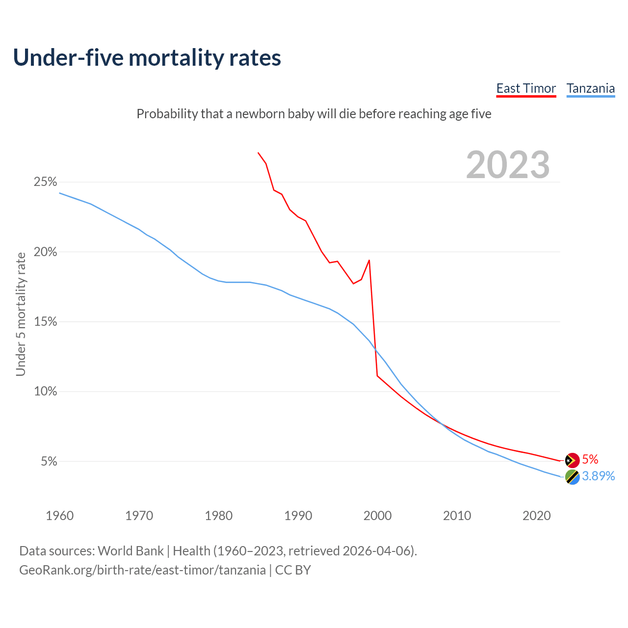 The chance that a newborn baby will die before reaching age five is 5% in East Timor and 3.89% in Tanzania. Above is a chart with historical data on under-five mortality rates.