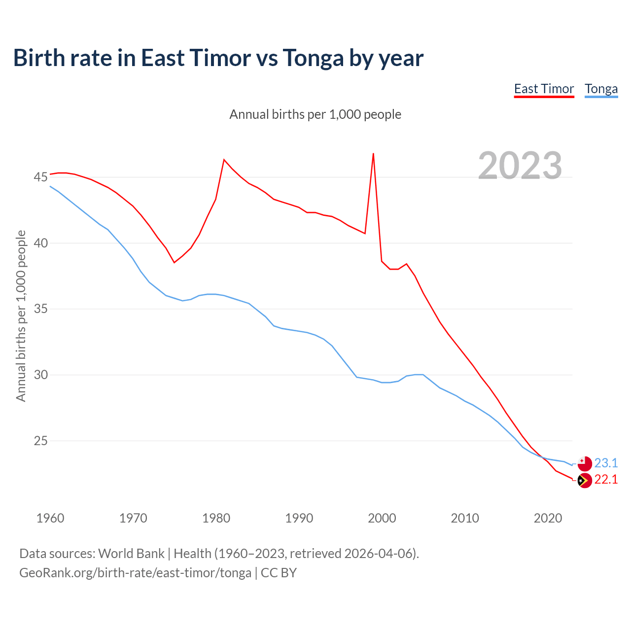 East Timor has an annual birth rate of 22.1 births per 1,000 people, compared to 23.1 for Tonga. The average number of children a woman is expected to have during her lifetime — the fertility rate, is 2.71 in East Timor and 3.13 in Tonga — 15.6% difference.