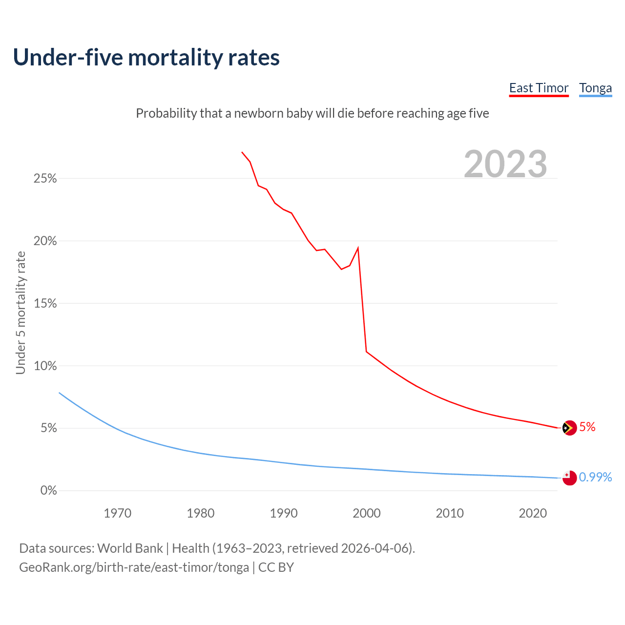 The chance that a newborn baby will die before reaching age five is 5% in East Timor and 0.99% in Tonga. Above is a chart with historical data on under-five mortality rates.