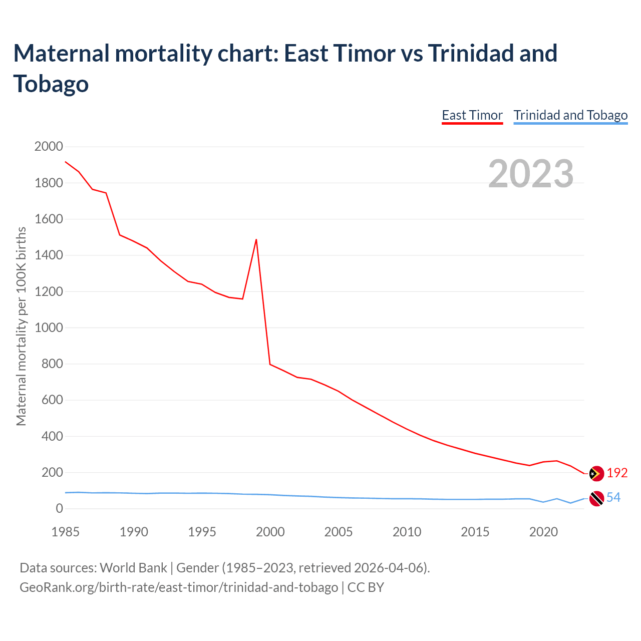 The maternal mortality rate, which is the probability of dying during childbirth or within 42 days of pregnancy termination, is 192 deaths per 100,000 live births in East Timor, compared to 54 deaths in Trinidad and Tobago.