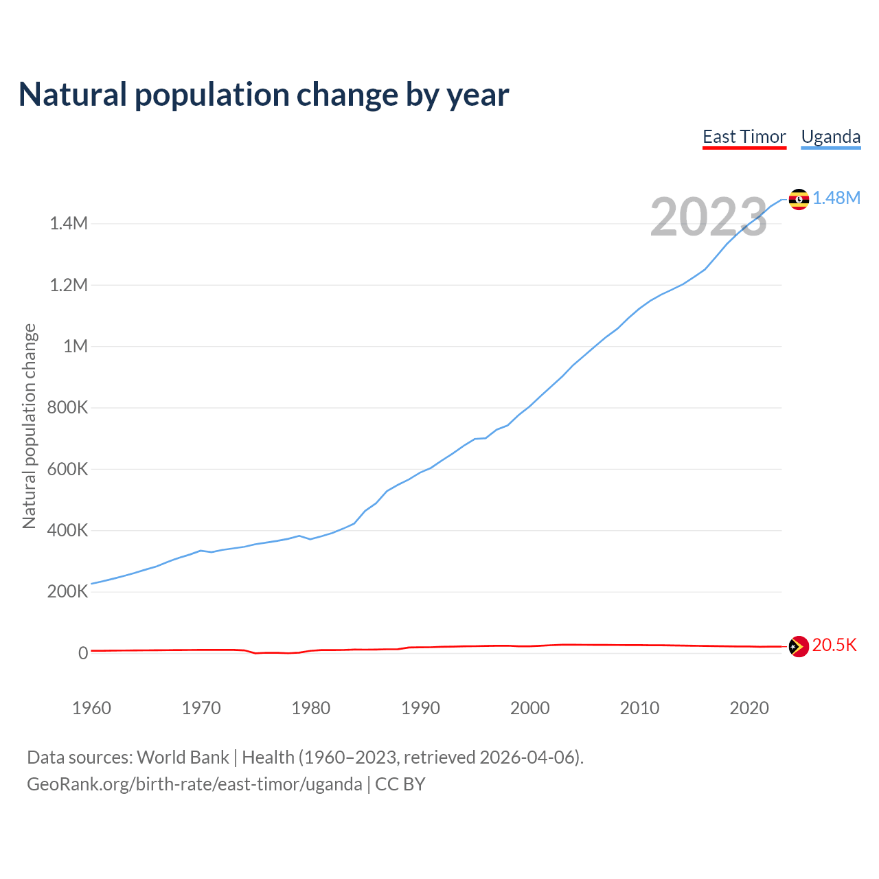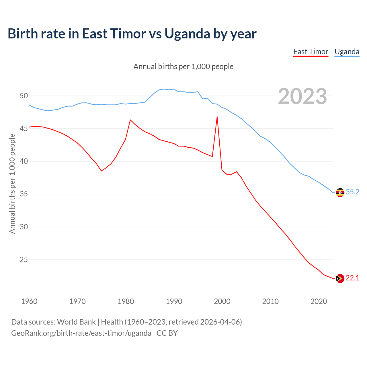 East Timor has an annual birth rate of 22.1 births per 1,000 people, compared to 35.2 for Uganda. The average number of children a woman is expected to have during her lifetime — the fertility rate, is 2.71 in East Timor and 4.28 in Uganda — 58.2% difference.
