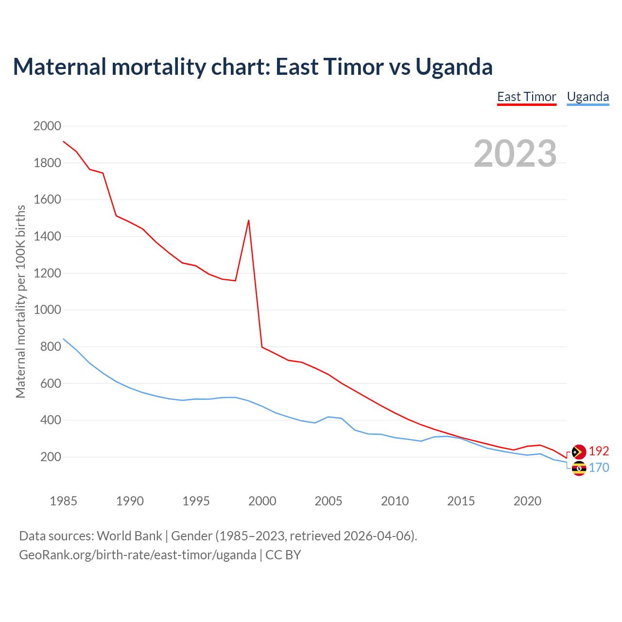 The maternal mortality rate, which is the probability of dying during childbirth or within 42 days of pregnancy termination, is 192 deaths per 100,000 live births in East Timor, compared to 170 deaths in Uganda.