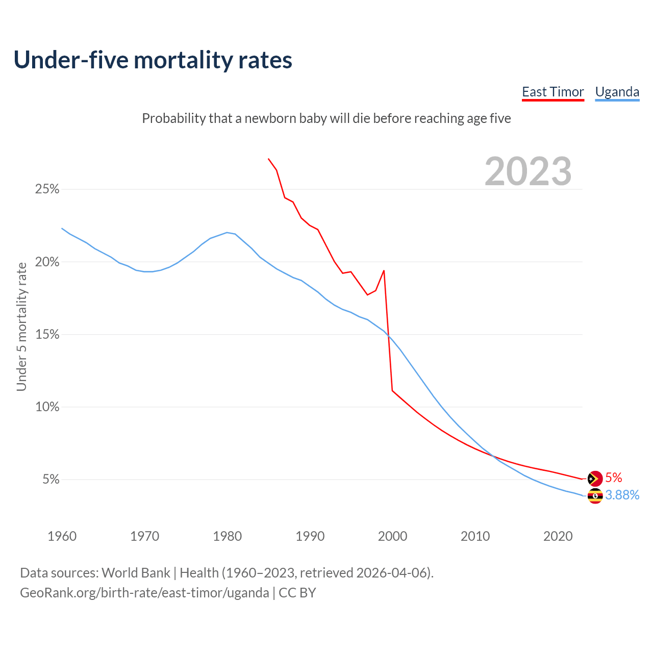 The chance that a newborn baby will die before reaching age five is 5% in East Timor and 3.88% in Uganda. Above is a chart with historical data on under-five mortality rates.