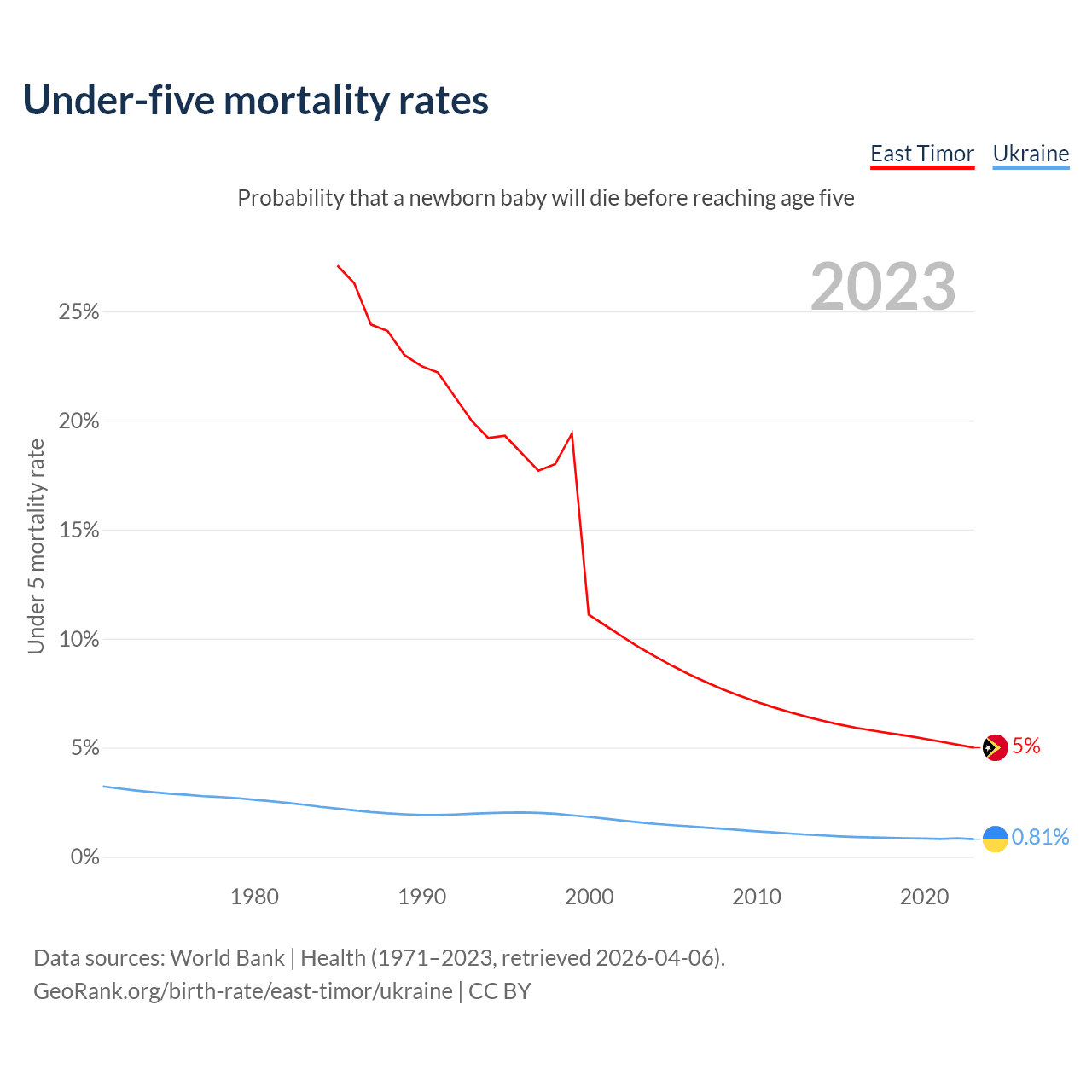 The chance that a newborn baby will die before reaching age five is 5% in East Timor and 0.81% in Ukraine. Above is a chart with historical data on under-five mortality rates.
