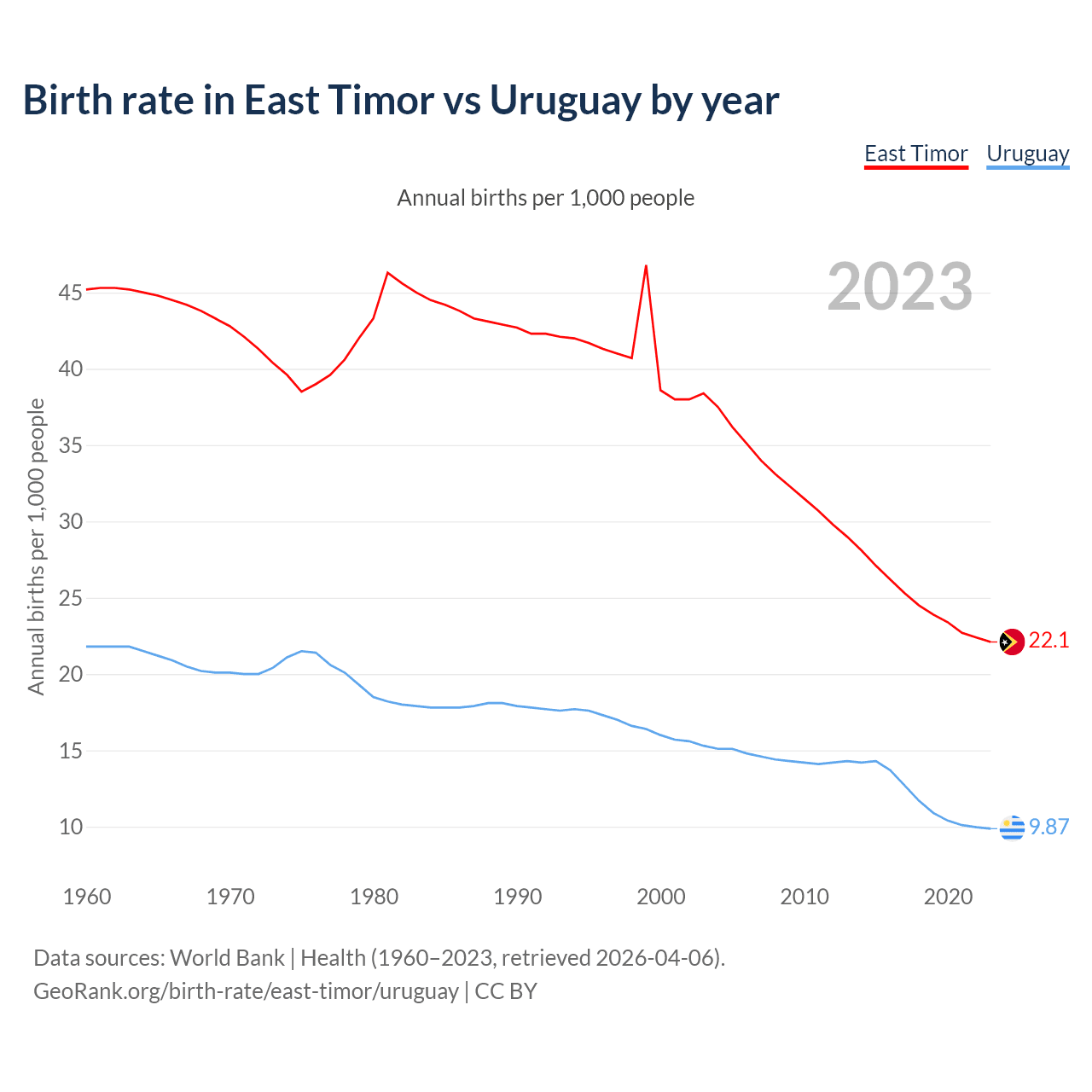East Timor has an annual birth rate of 22.1 births per 1,000 people, compared to 9.87 for Uruguay. The average number of children a woman is expected to have during her lifetime — the fertility rate, is 2.71 in East Timor and 1.41 in Uruguay — 47.9% difference.