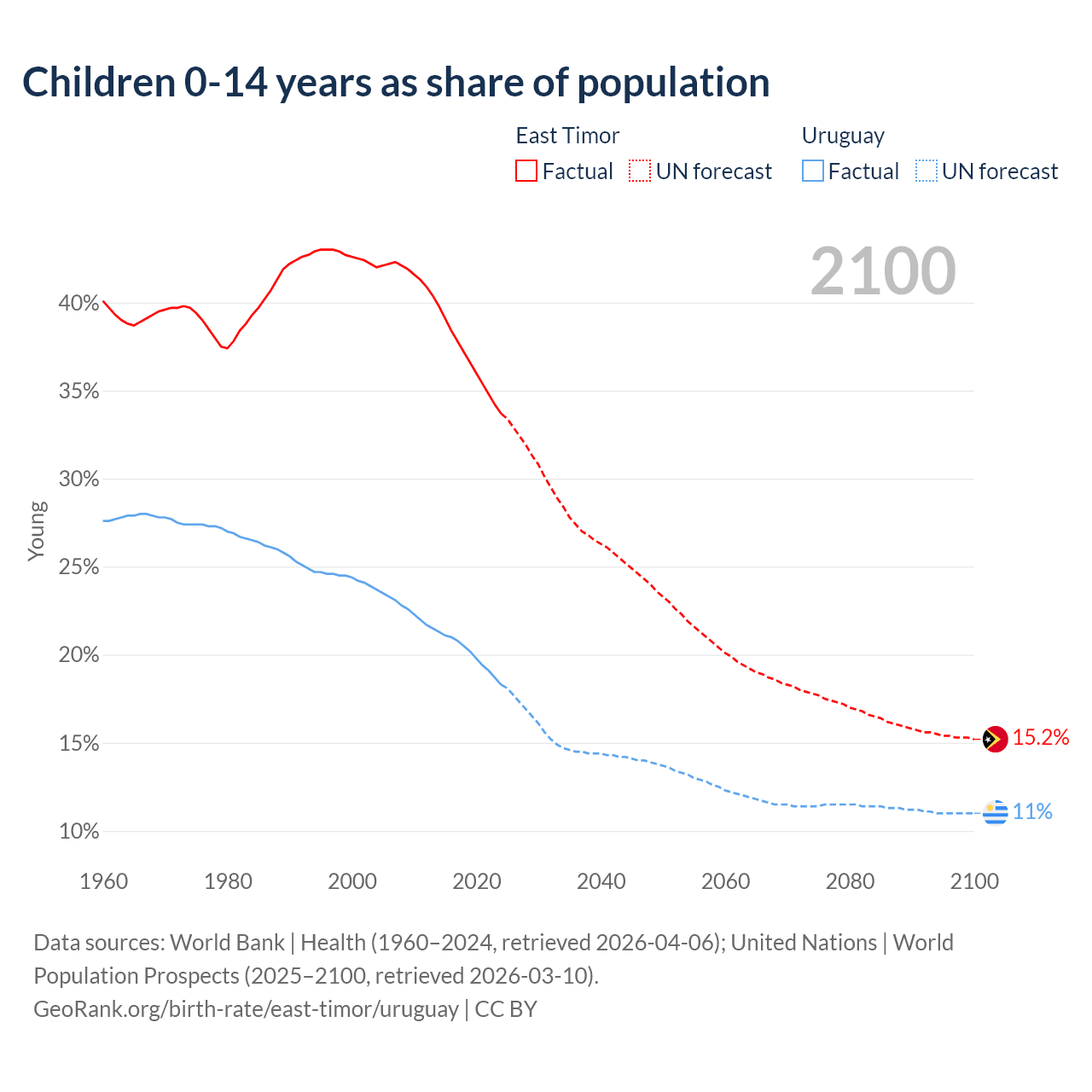 According to the latest available data on birth rates, the fertility rate in East Timor was 2.71 children per woman in 2023, compared to 1.41 in Uruguay in 2023. The replacement level is considered to be 2.1 children per woman.