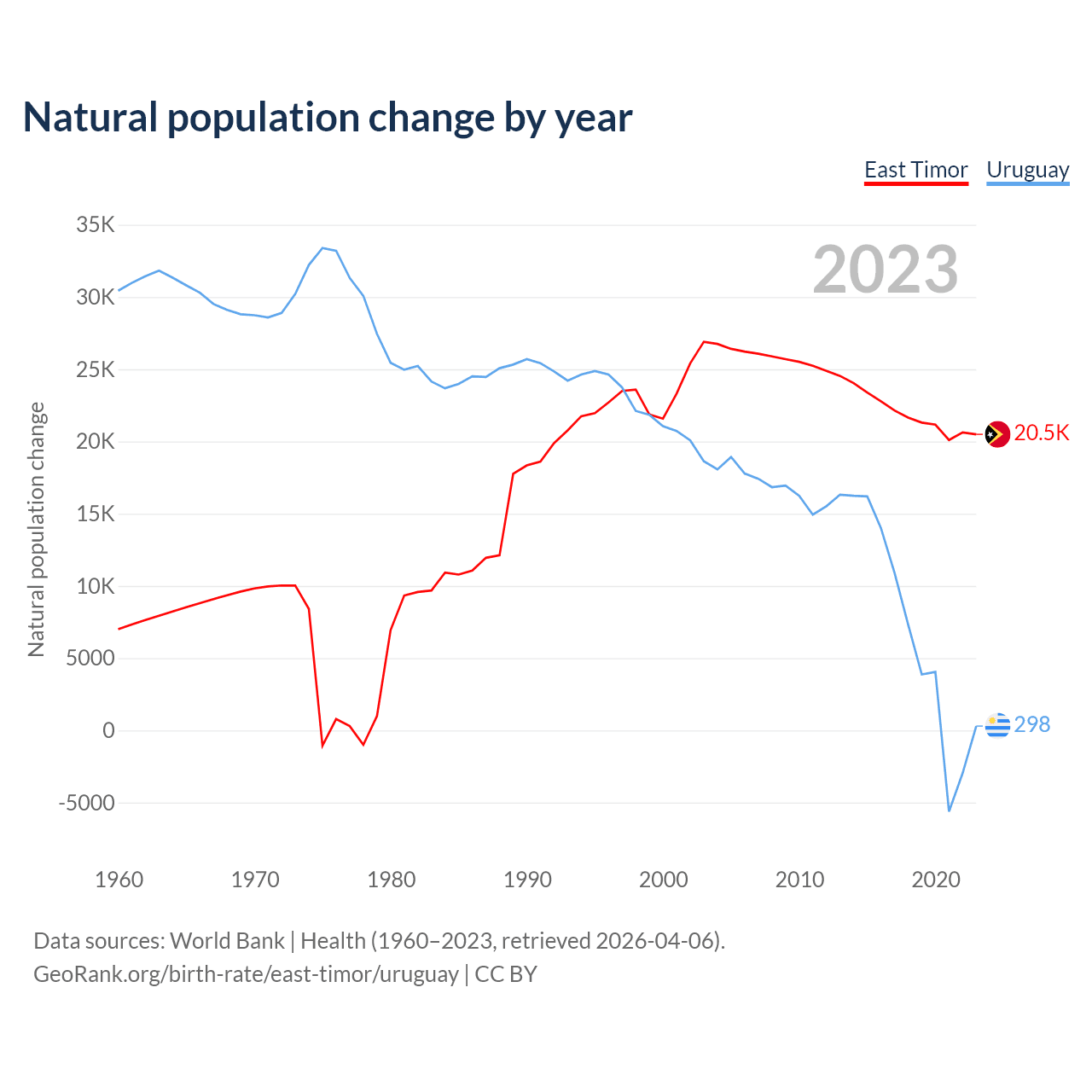 - East Timor is ranked 62/196 by birth rate compared to 149/196 for Uruguay.