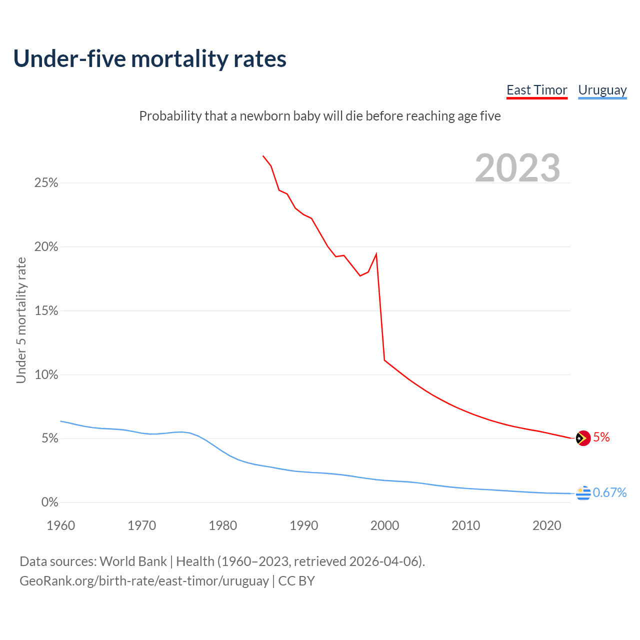 The chance that a newborn baby will die before reaching age five is 5% in East Timor and 0.67% in Uruguay. Above is a chart with historical data on under-five mortality rates.
