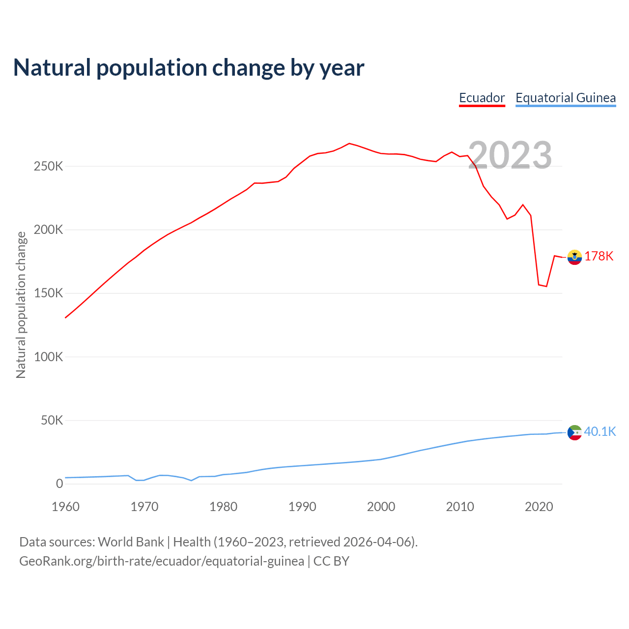Ecuador has an annual birth rate of 15 births per 1,000 people, compared to 29.6 for Equatorial Guinea. The average number of children a woman is expected to have during her lifetime — the fertility rate, is 1.82 in Ecuador and 4.08 in Equatorial Guinea — 123.9% difference.
