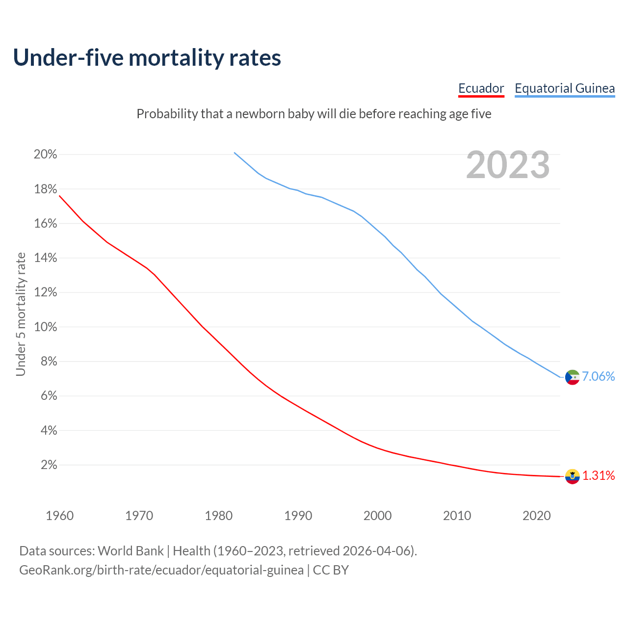 The chance that a newborn baby will die before reaching age five is 1.31% in Ecuador and 7.06% in Equatorial Guinea. Above is a chart with historical data on under-five mortality rates.