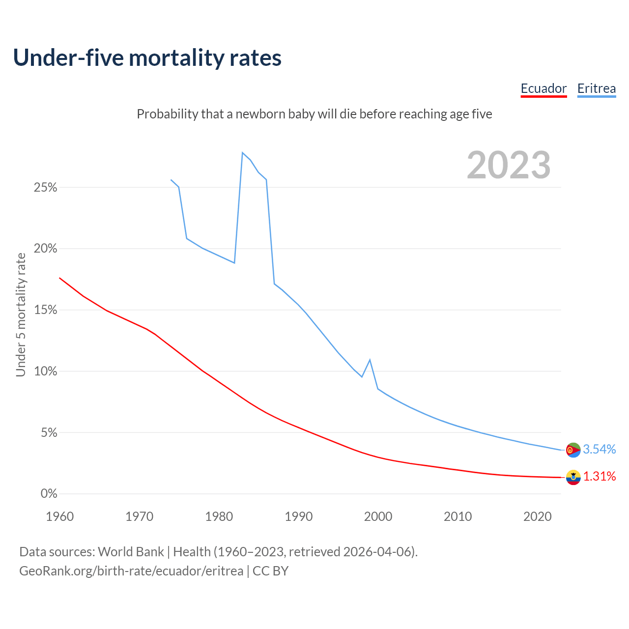 The chance that a newborn baby will die before reaching age five is 1.31% in Ecuador and 3.54% in Eritrea. Above is a chart with historical data on under-five mortality rates.