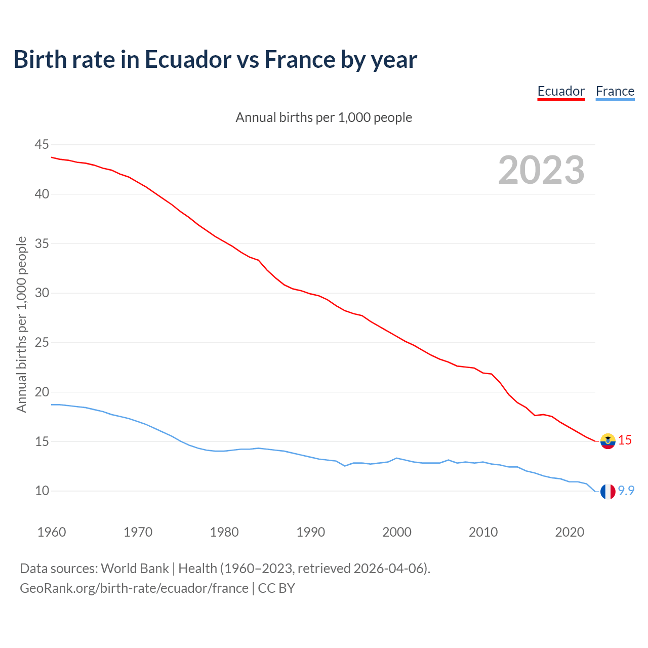Ecuador has an annual birth rate of 15 births per 1,000 people, compared to 9.9 for France. The average number of children a woman is expected to have during her lifetime — the fertility rate, is 1.82 in Ecuador and 1.66 in France — 8.94% difference.