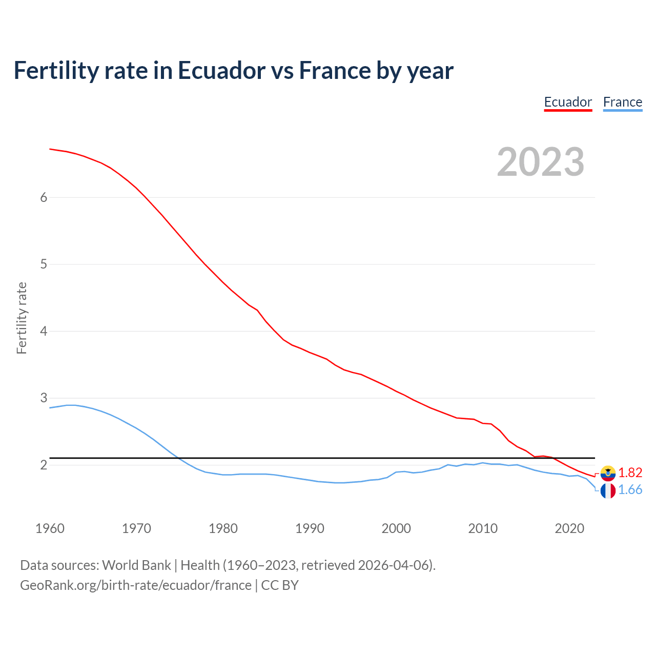 According to the latest available data on birth rates, the fertility rate in Ecuador was 1.82 children per woman in 2023, compared to 1.66 in France in 2023. The replacement level is considered to be 2.1 children per woman.
