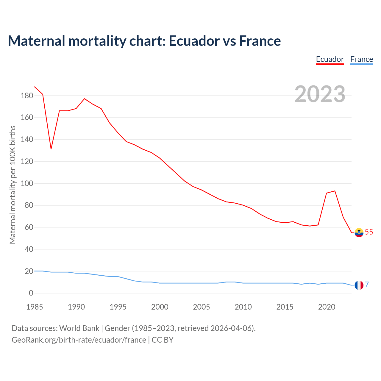 The maternal mortality rate, which is the probability of dying during childbirth or within 42 days of pregnancy termination, is 55 deaths per 100,000 live births in Ecuador, compared to 7 deaths in France.