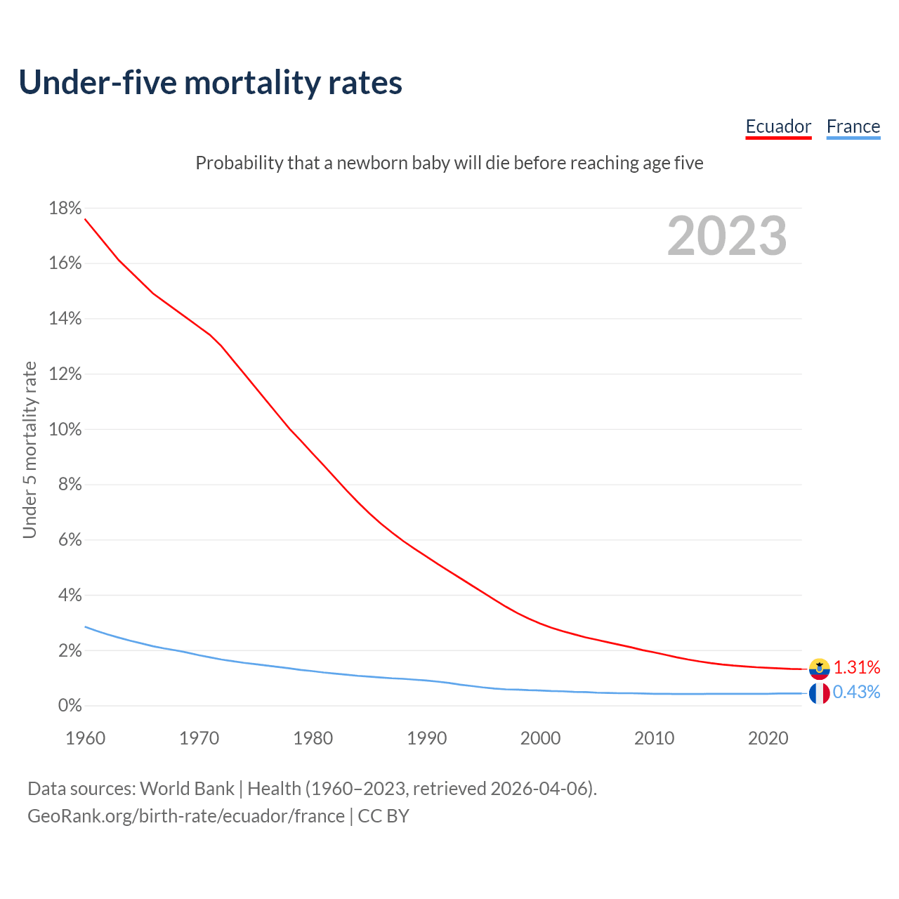 The chance that a newborn baby will die before reaching age five is 1.31% in Ecuador and 0.43% in France. Above is a chart with historical data on under-five mortality rates.