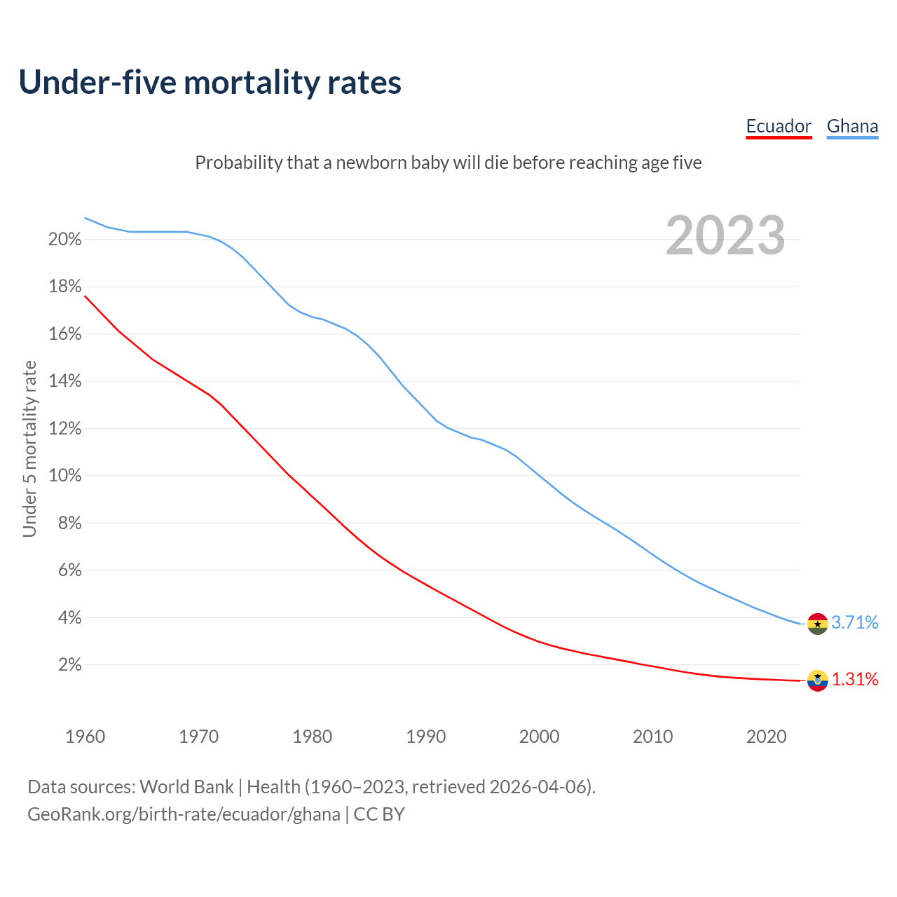 The chance that a newborn baby will die before reaching age five is 1.31% in Ecuador and 3.71% in Ghana. Above is a chart with historical data on under-five mortality rates.