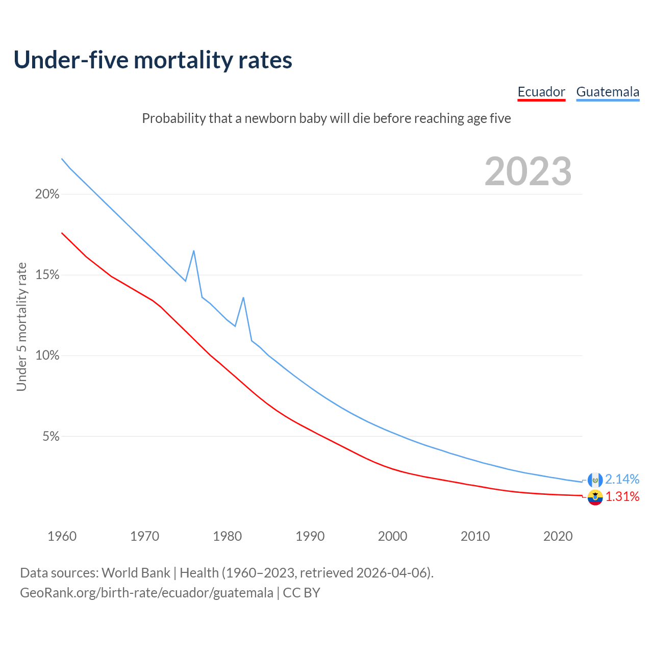 The chance that a newborn baby will die before reaching age five is 1.31% in Ecuador and 2.14% in Guatemala. Above is a chart with historical data on under-five mortality rates.