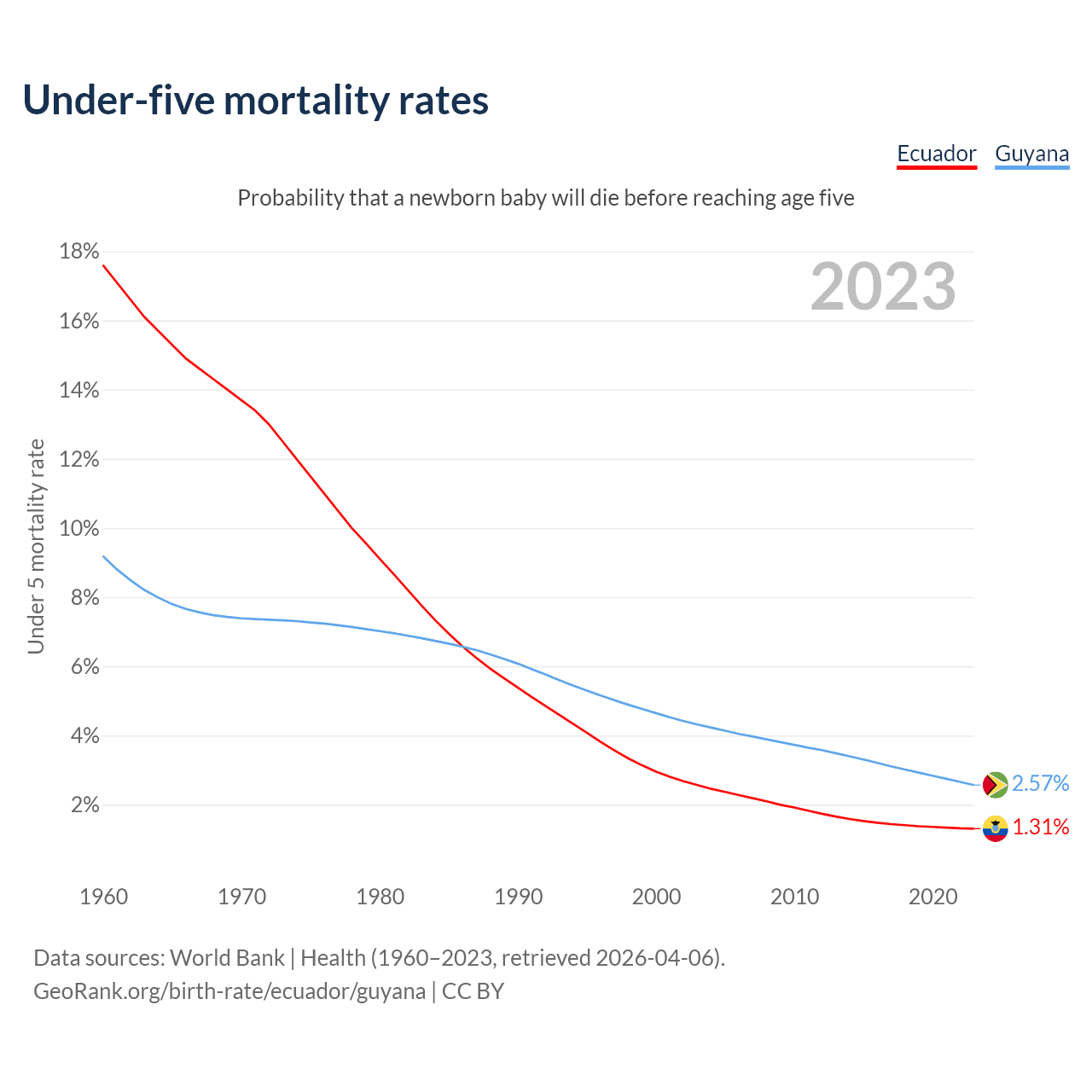 The chance that a newborn baby will die before reaching age five is 1.31% in Ecuador and 2.57% in Guyana. Above is a chart with historical data on under-five mortality rates.