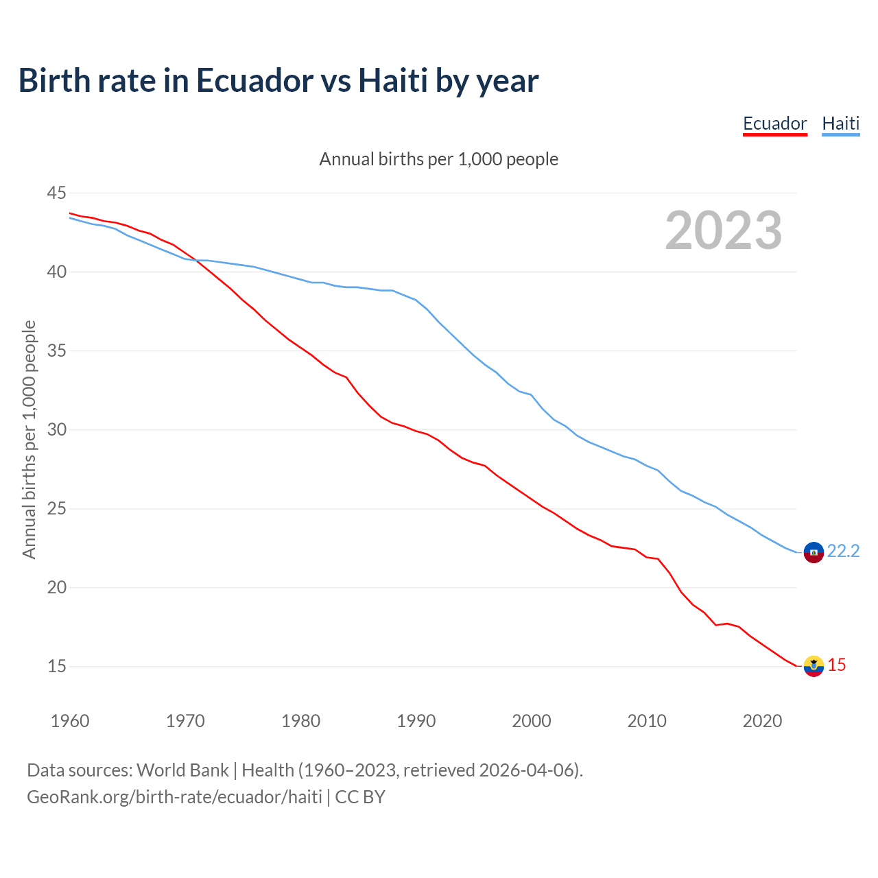 Ecuador has an annual birth rate of 15 births per 1,000 people, compared to 22.2 for Haiti. The average number of children a woman is expected to have during her lifetime — the fertility rate, is 1.82 in Ecuador and 2.66 in Haiti — 45.7% difference.