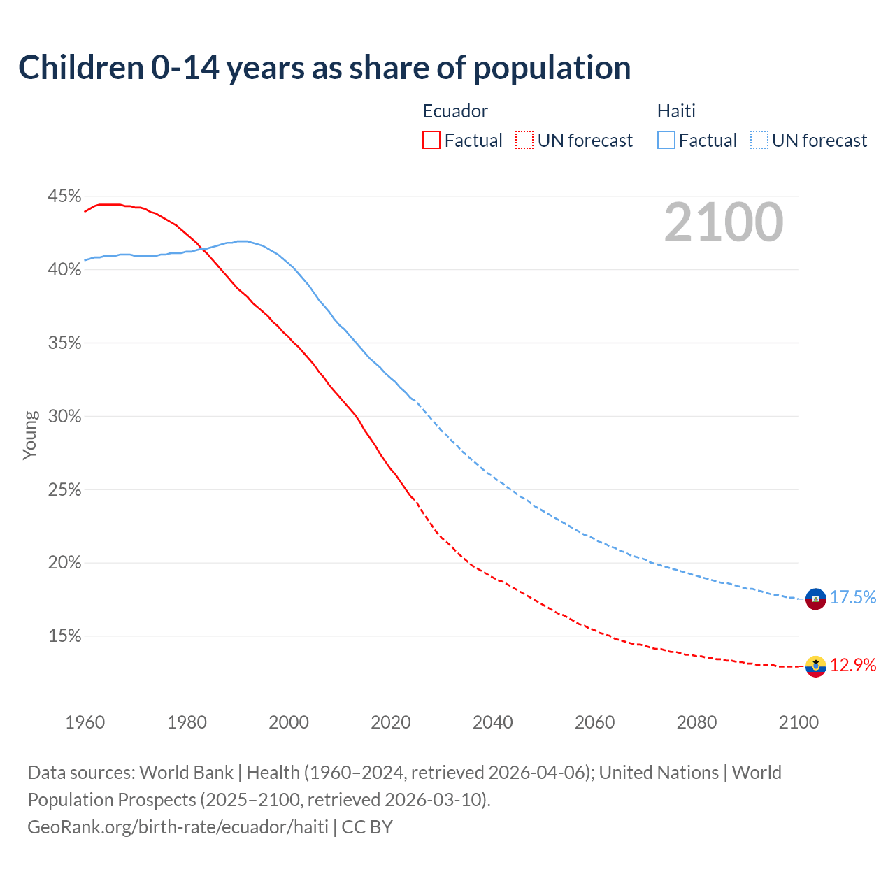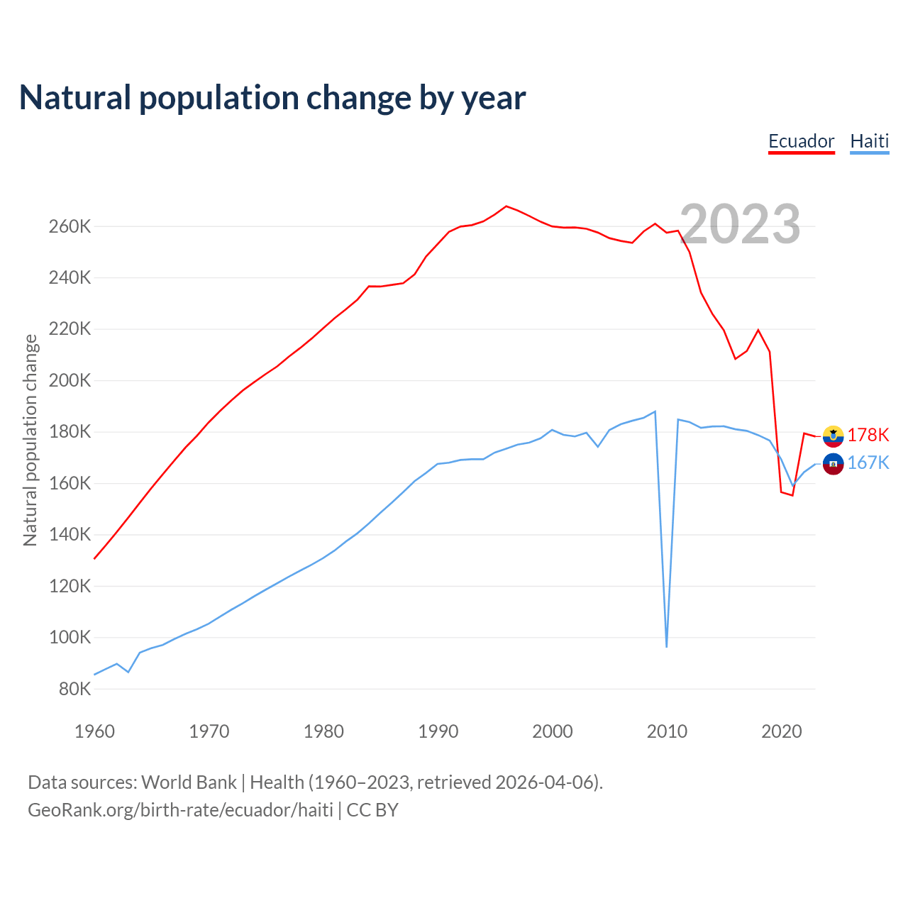 According to the latest available data on birth rates, the fertility rate in Ecuador was 1.82 children per woman in 2023, compared to 2.66 in Haiti in 2023. The replacement level is considered to be 2.1 children per woman.