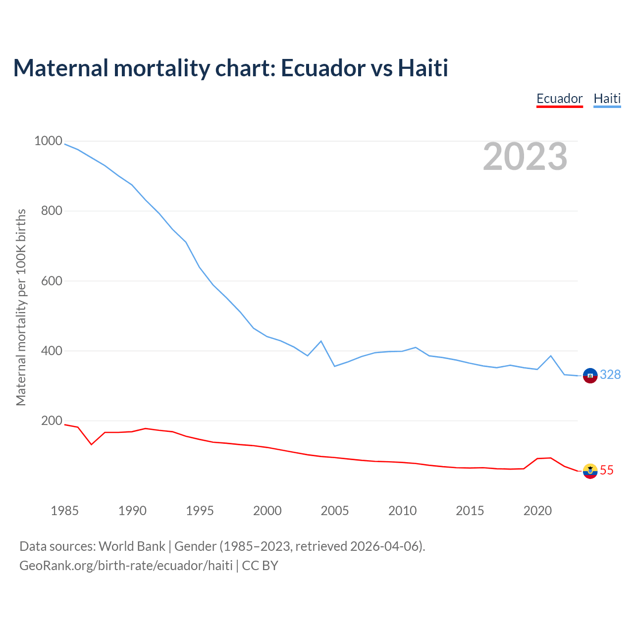 The maternal mortality rate, which is the probability of dying during childbirth or within 42 days of pregnancy termination, is 55 deaths per 100,000 live births in Ecuador, compared to 328 deaths in Haiti.
