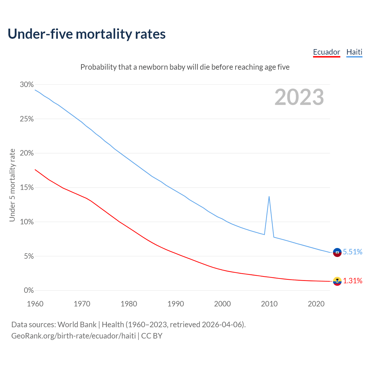 The chance that a newborn baby will die before reaching age five is 1.31% in Ecuador and 5.51% in Haiti. Above is a chart with historical data on under-five mortality rates.