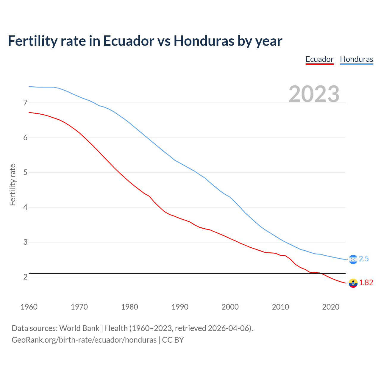 1960 vs 2023, the fertility rate has decreased by 72.9% in Ecuador and by 66.5% in Honduras — in 1960, it was 6.72 and 7.46, respectively.