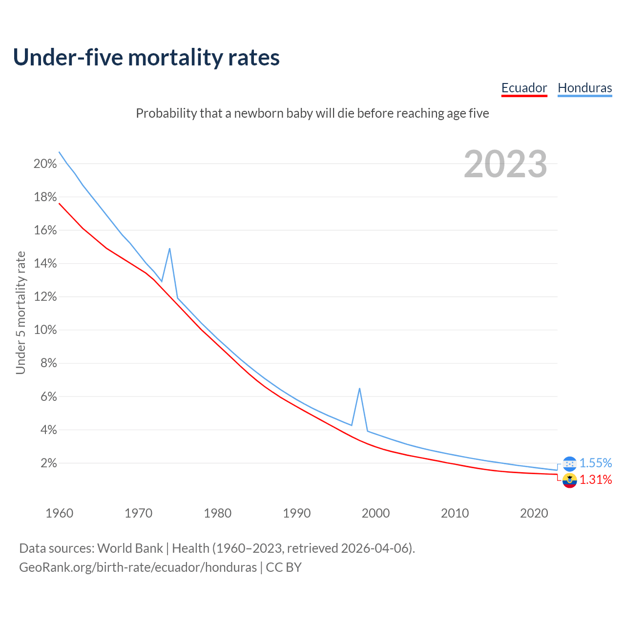 The chance that a newborn baby will die before reaching age five is 1.31% in Ecuador and 1.55% in Honduras. Above is a chart with historical data on under-five mortality rates.