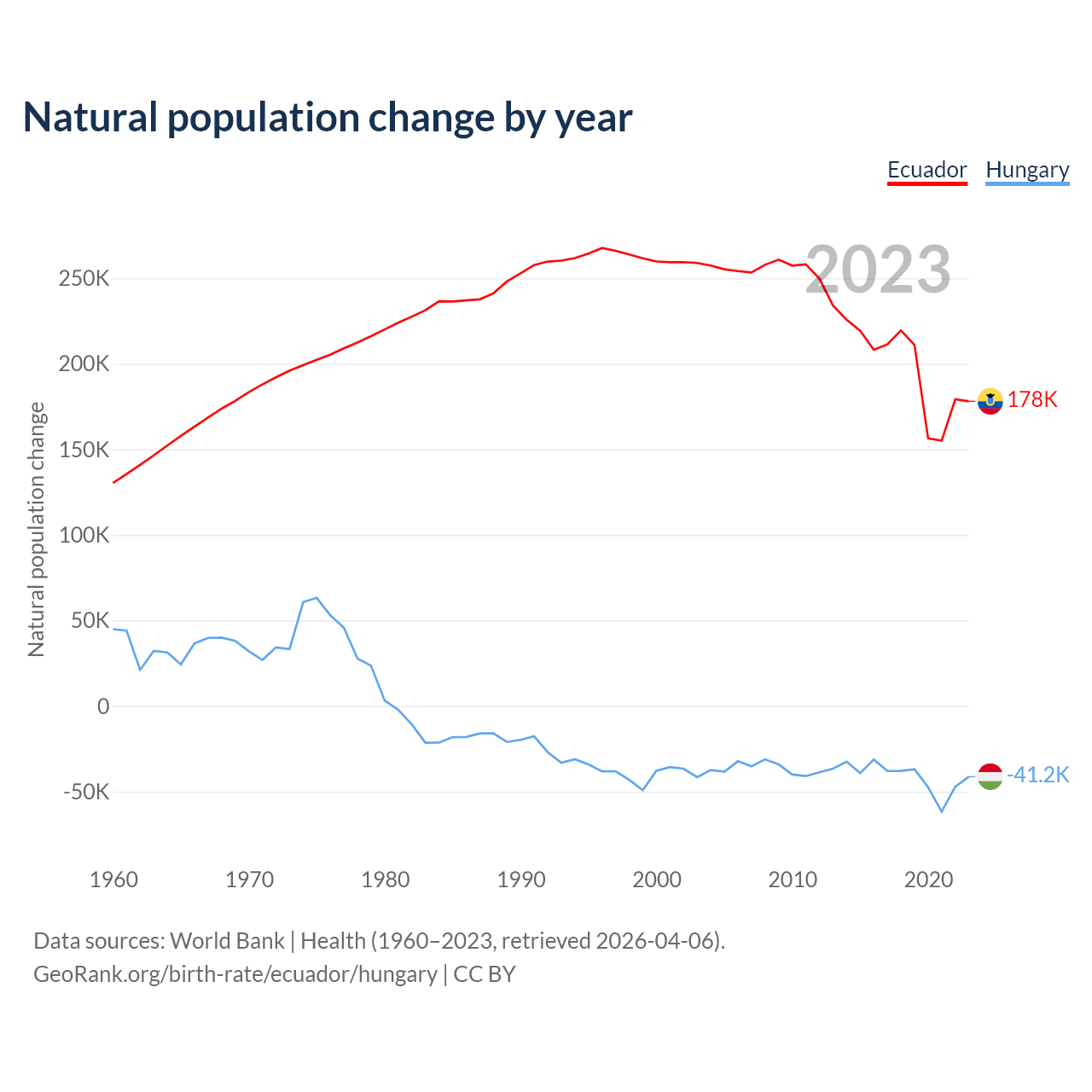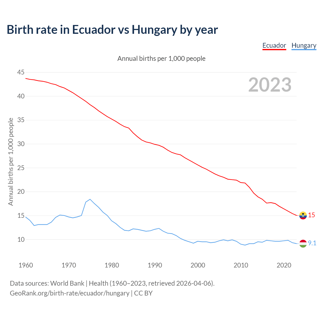 Ecuador has an annual birth rate of 15 births per 1,000 people, compared to 9.1 for Hungary. The average number of children a woman is expected to have during her lifetime — the fertility rate, is 1.82 in Ecuador and 1.51 in Hungary — 17.2% difference.