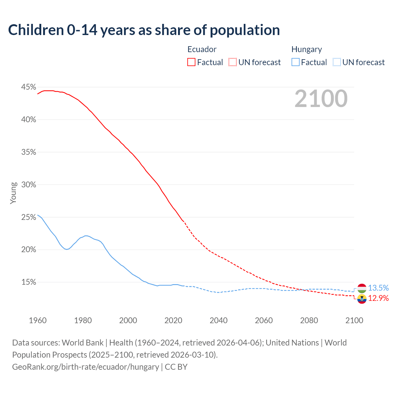According to the latest available data on birth rates, the fertility rate in Ecuador was 1.82 children per woman in 2023, compared to 1.51 in Hungary in 2023. The replacement level is considered to be 2.1 children per woman.